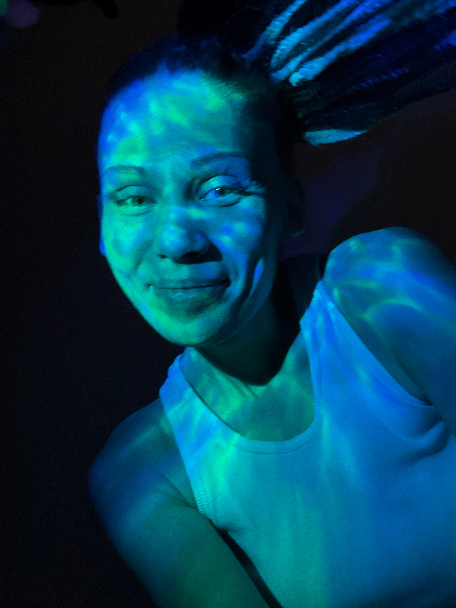 The image features a rotated close-up portrait of a person, likely female, set against a predominantly dark background. The subject's head is positioned towards the left of the frame, with her body ex…read more