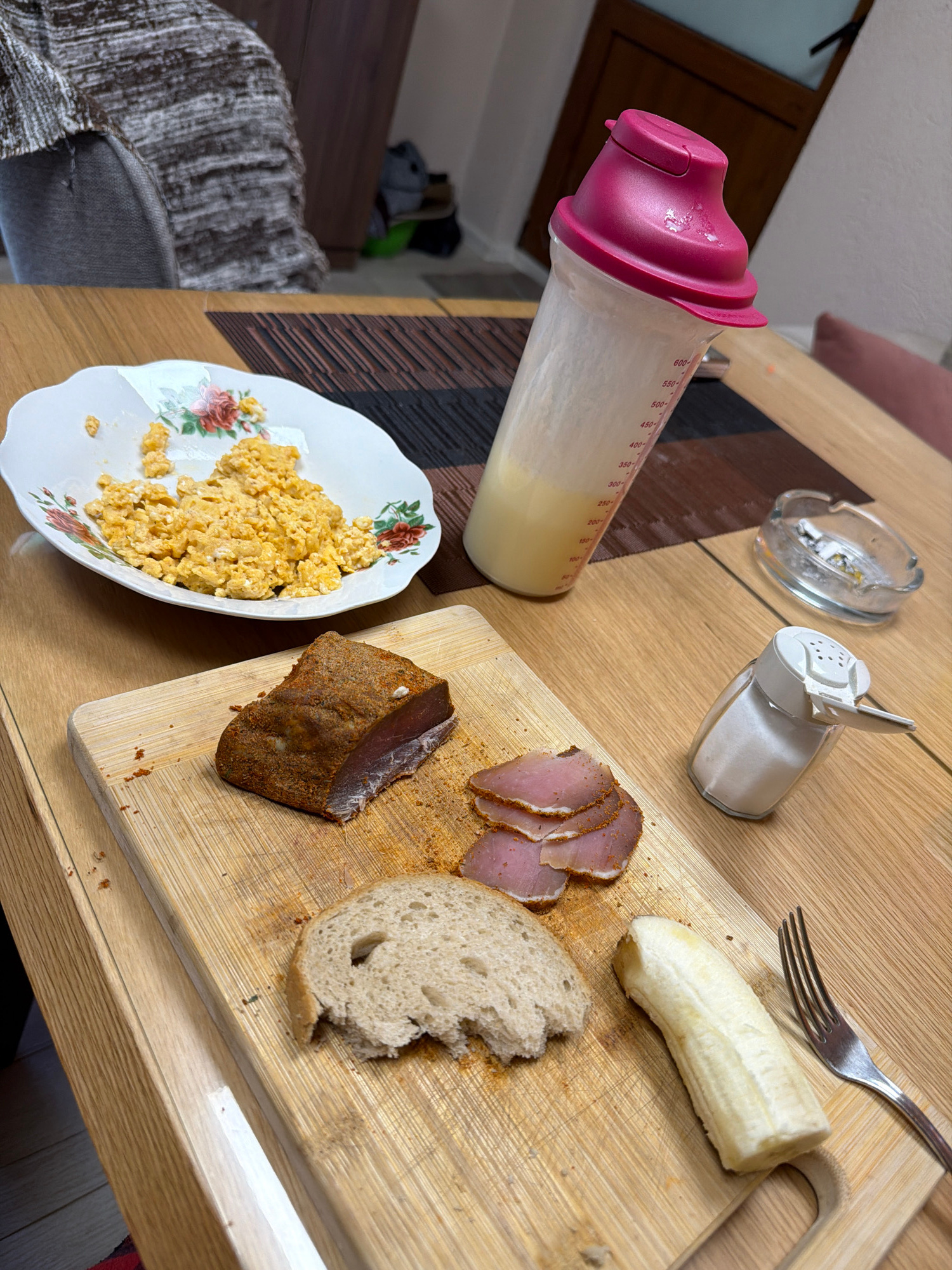 A high-angle shot depicts a table laden with food and other items. A plate filled with scrambled eggs sits to the left, adjacent to a baby bottle containing a milky liquid. A wooden cutting board occu…read more