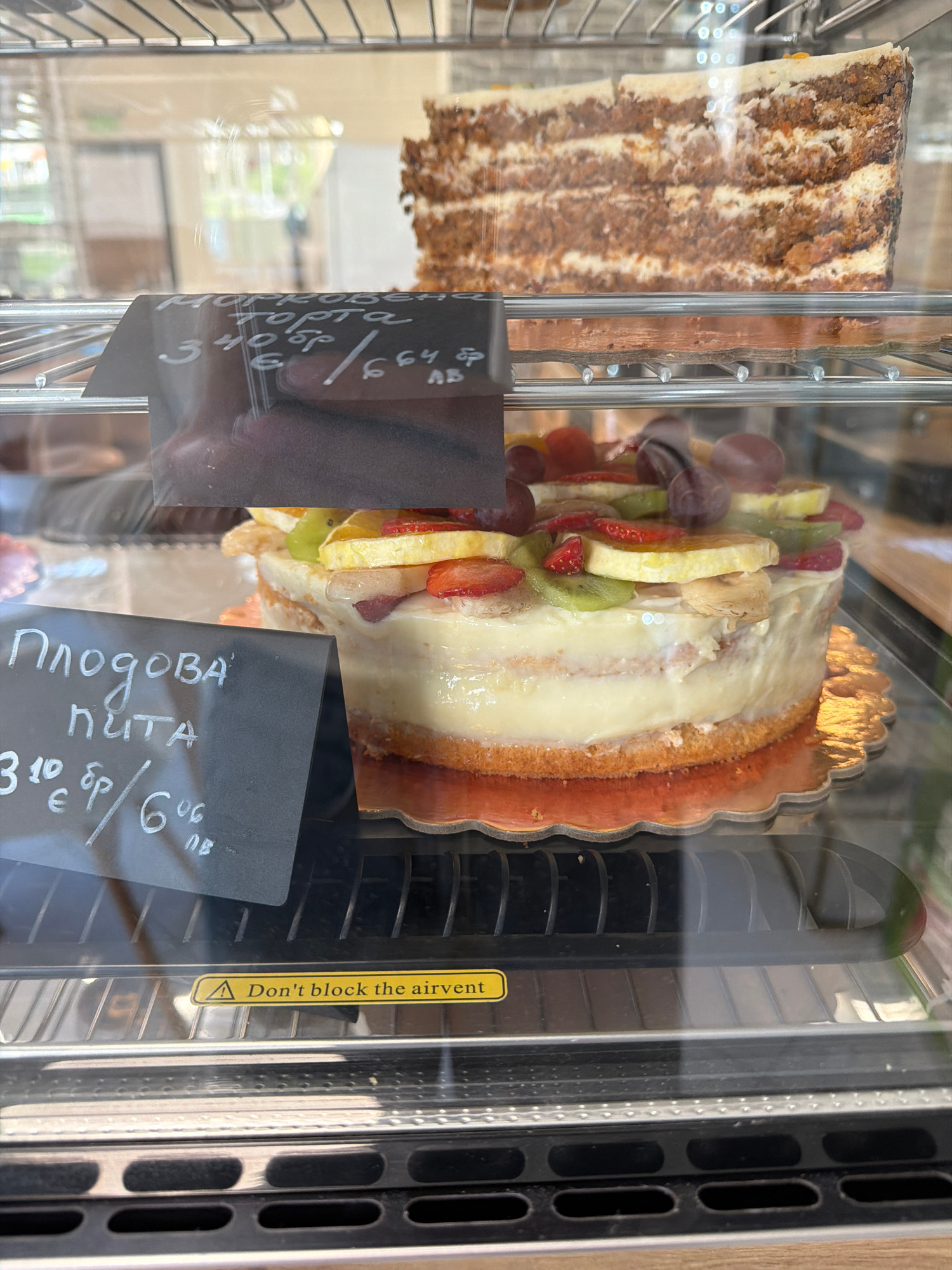 The image captures a display case showcasing two types of cake, presumably in a café or bakery. On the left, a slice of layered cake with brown and white frosting is visible. To the right, a fruit-top…read more