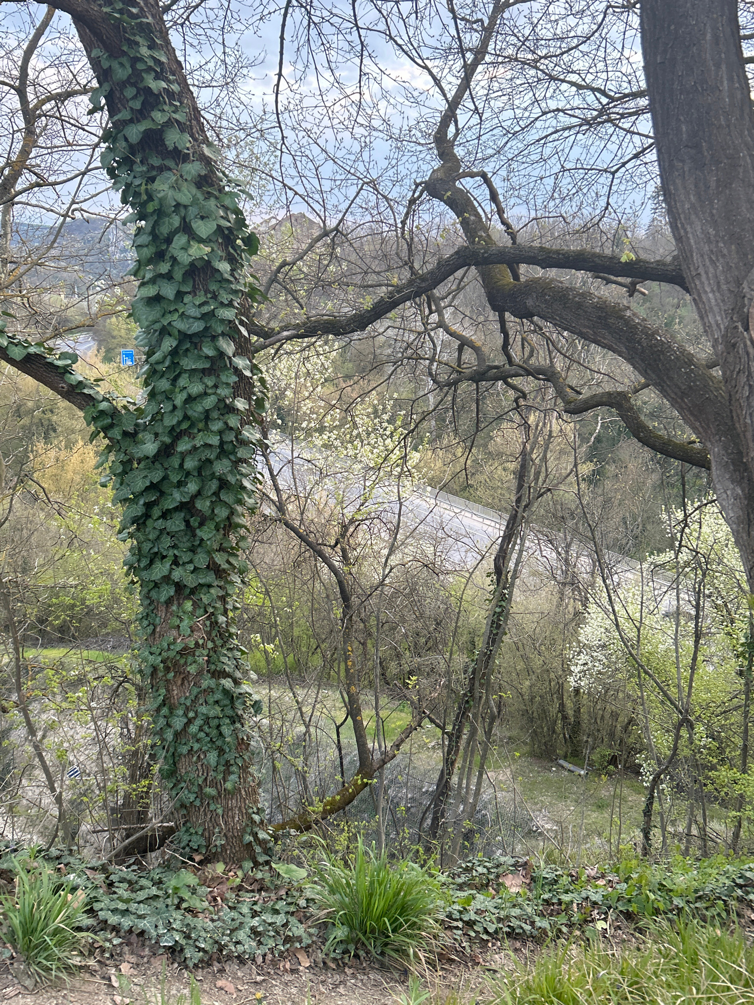 The image shows a view in Veliko Tarnovo, Bulgaria. The foreground features a tree trunk covered in ivy. Through the bare branches of surrounding trees, a bridge is visible, potentially spanning the Y…read more