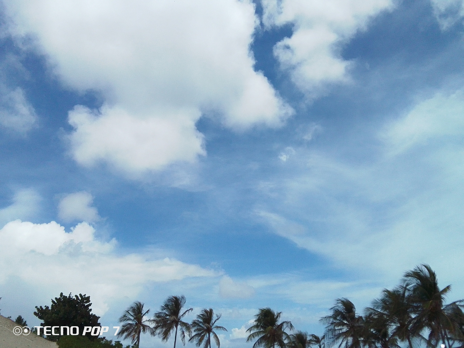 The image is a landscape of palm trees and a non-specific tree, against a blue sky filled with white clouds. The lower left corner contains the words "Tecno Pop 7" as the camera model used to take the…read more