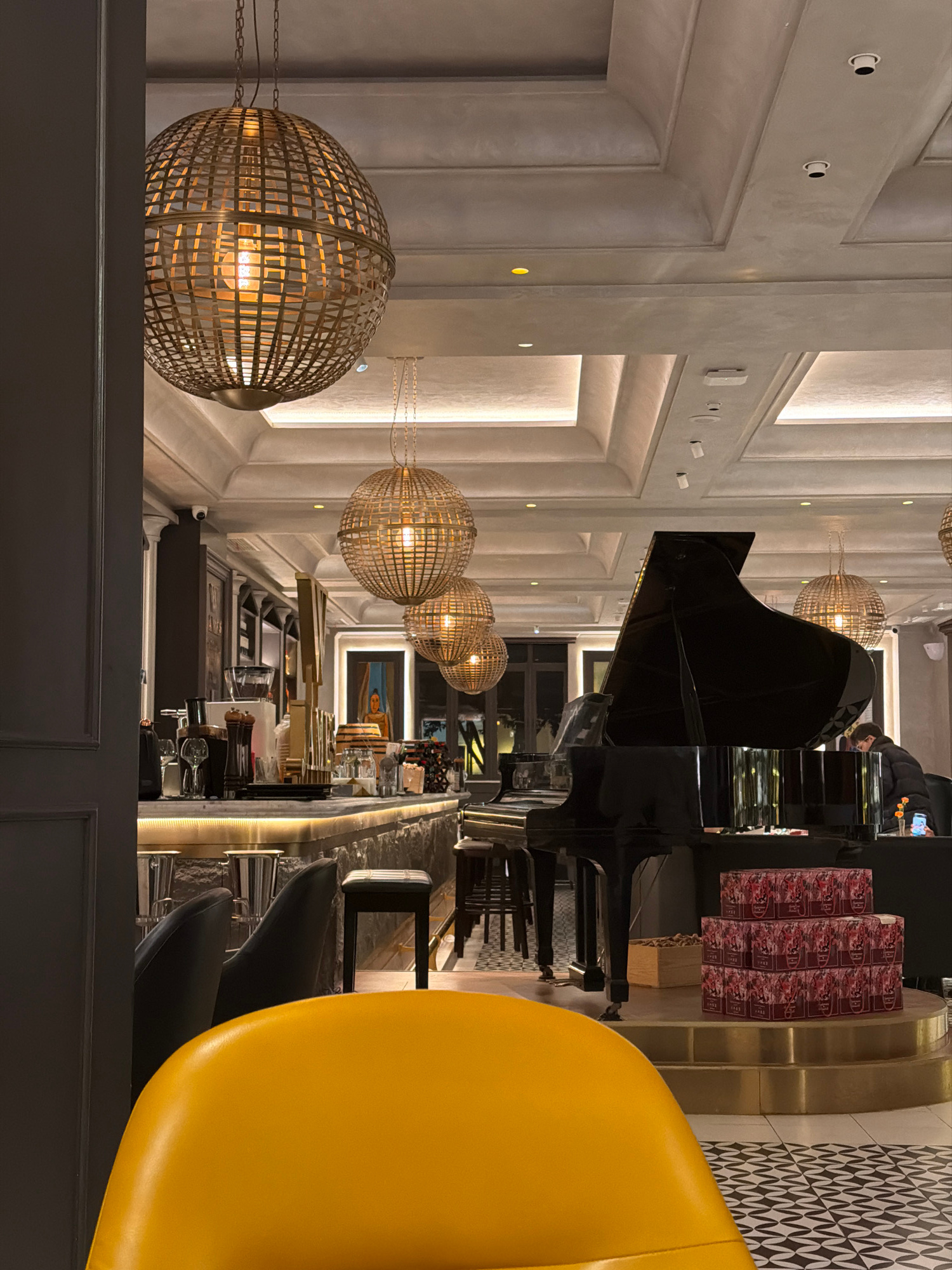 The image shows the interior of a building in Qinhuai District, China. The focal point is a grand piano situated near a bar area. Several spherical light fixtures hang from the ceiling. There are bar…read more
