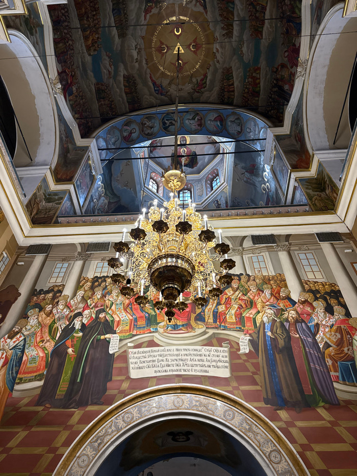 The image depicts the elaborate interior of St. Volodymyr's Cathedral in Kyiv, Ukraine, viewed looking upwards. A large, gilded, multi-tiered chandelier with numerous illuminated electric candle-light…read more
