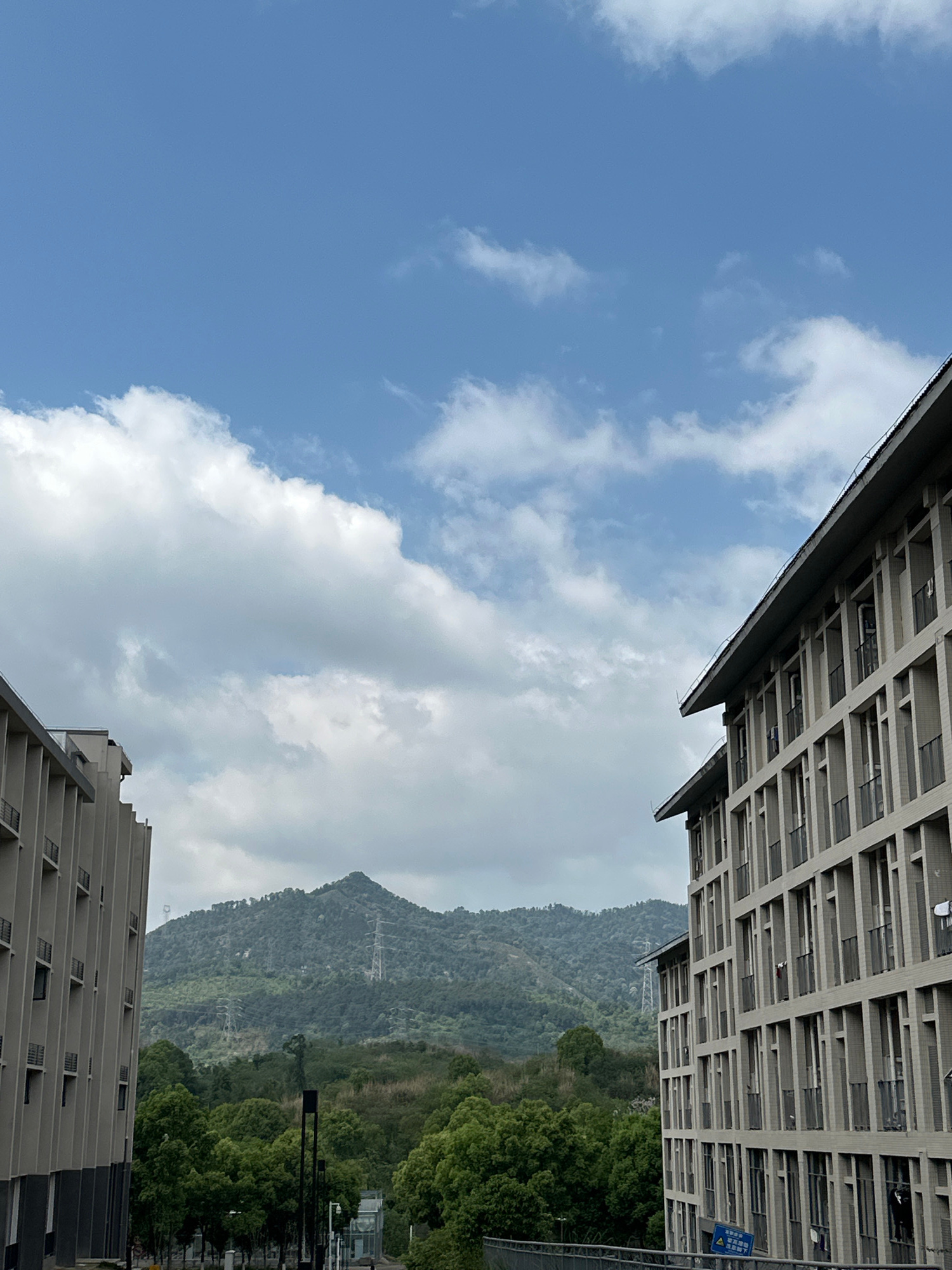 The image presents an upward view framed by the edges of two buildings. The sky is blue with scattered white clouds. A mountain range, covered in dense green vegetation, lies in the background. Electr…read more