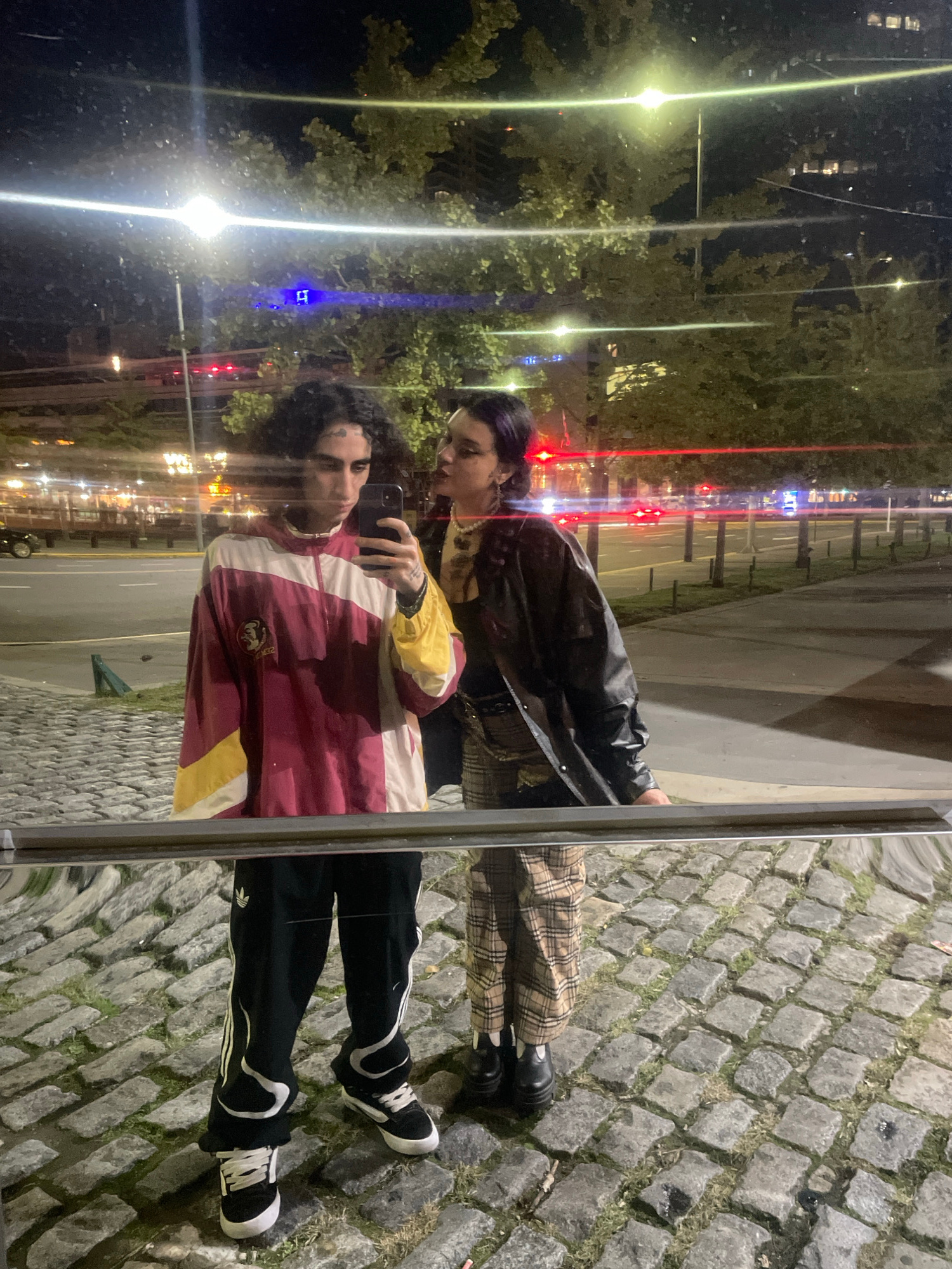 A mirrored image shows two individuals standing next to each other on a cobblestone sidewalk. The person in the foreground, presumably taking the photo, is wearing a red, white, and yellow striped jac…read more