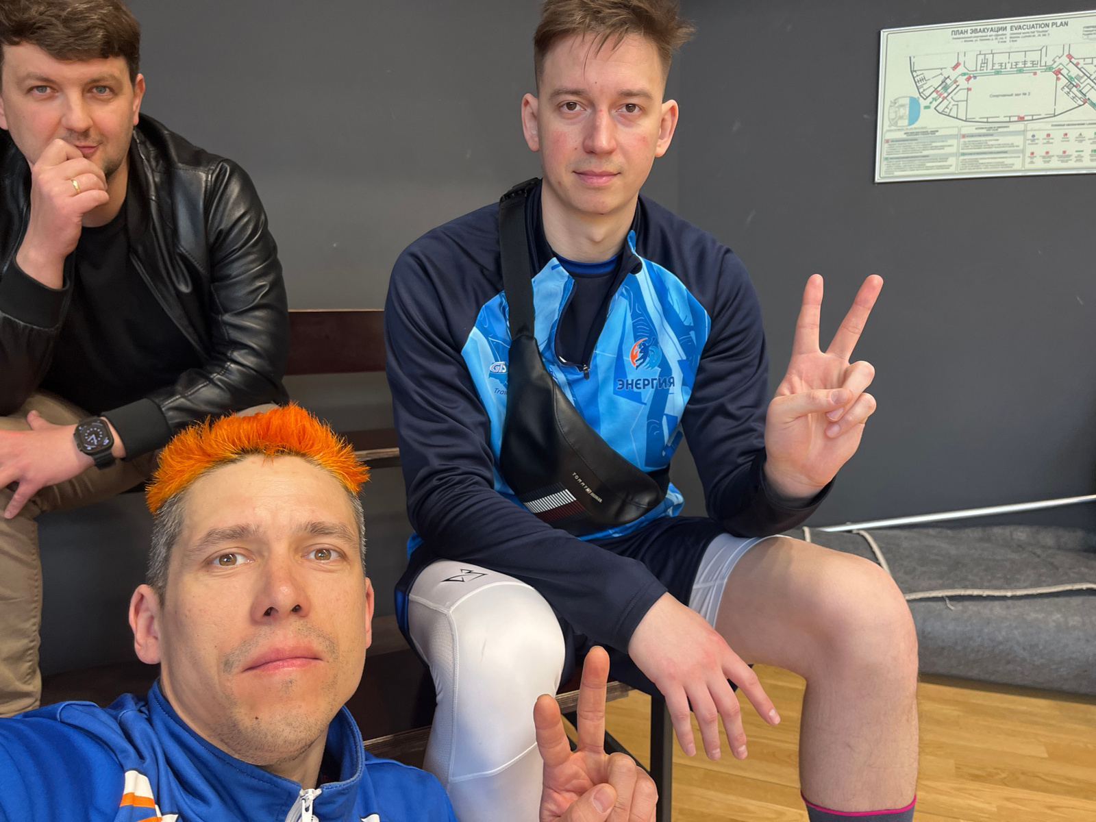 The image shows three individuals posing for a picture in an indoor setting, specifically at the Dynamo Volleyball Arena in Moscow, Russia. One person is wearing athletic gear, including a knee brace,…read more