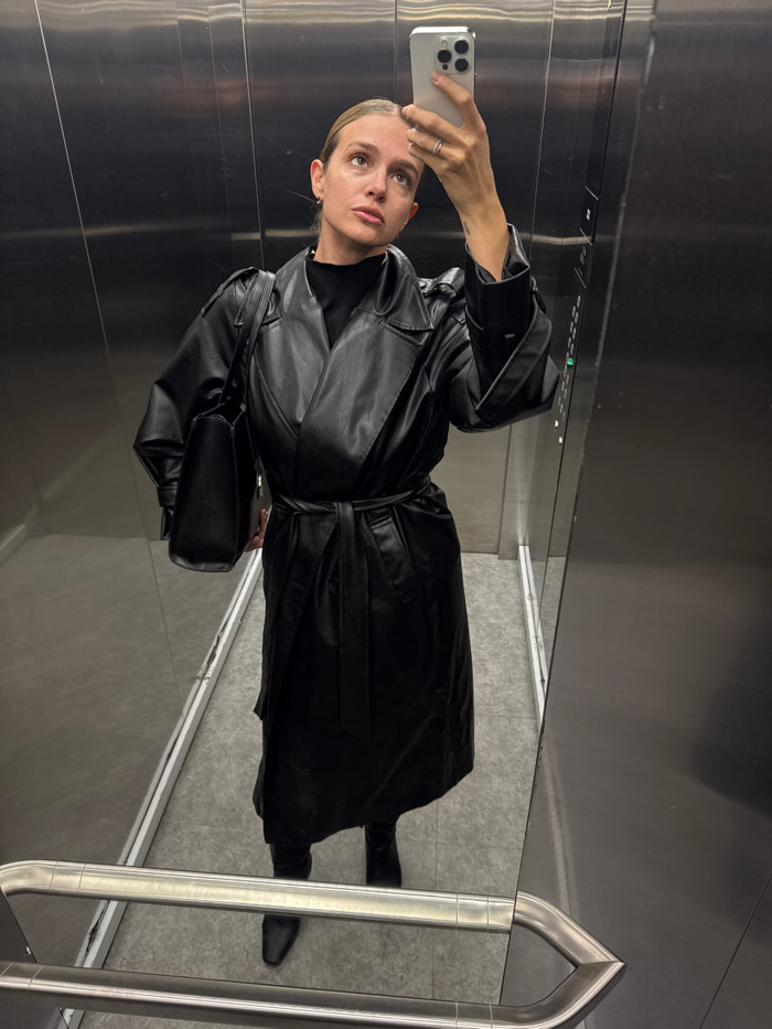 An adult female is standing inside a metal-paneled elevator, taking a mirror selfie. The location is the city of Unknown, Unknown. The subject wears a long black faux leather trench coat, belted at th…read more