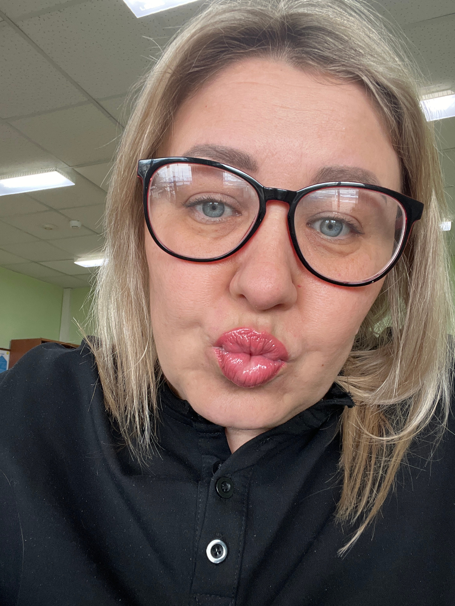 A woman with blonde hair and blue eyes is wearing black-rimmed glasses and a black collared shirt with buttons. She is pursing her lips in a pouting expression. The background shows a light-colored ce…read more