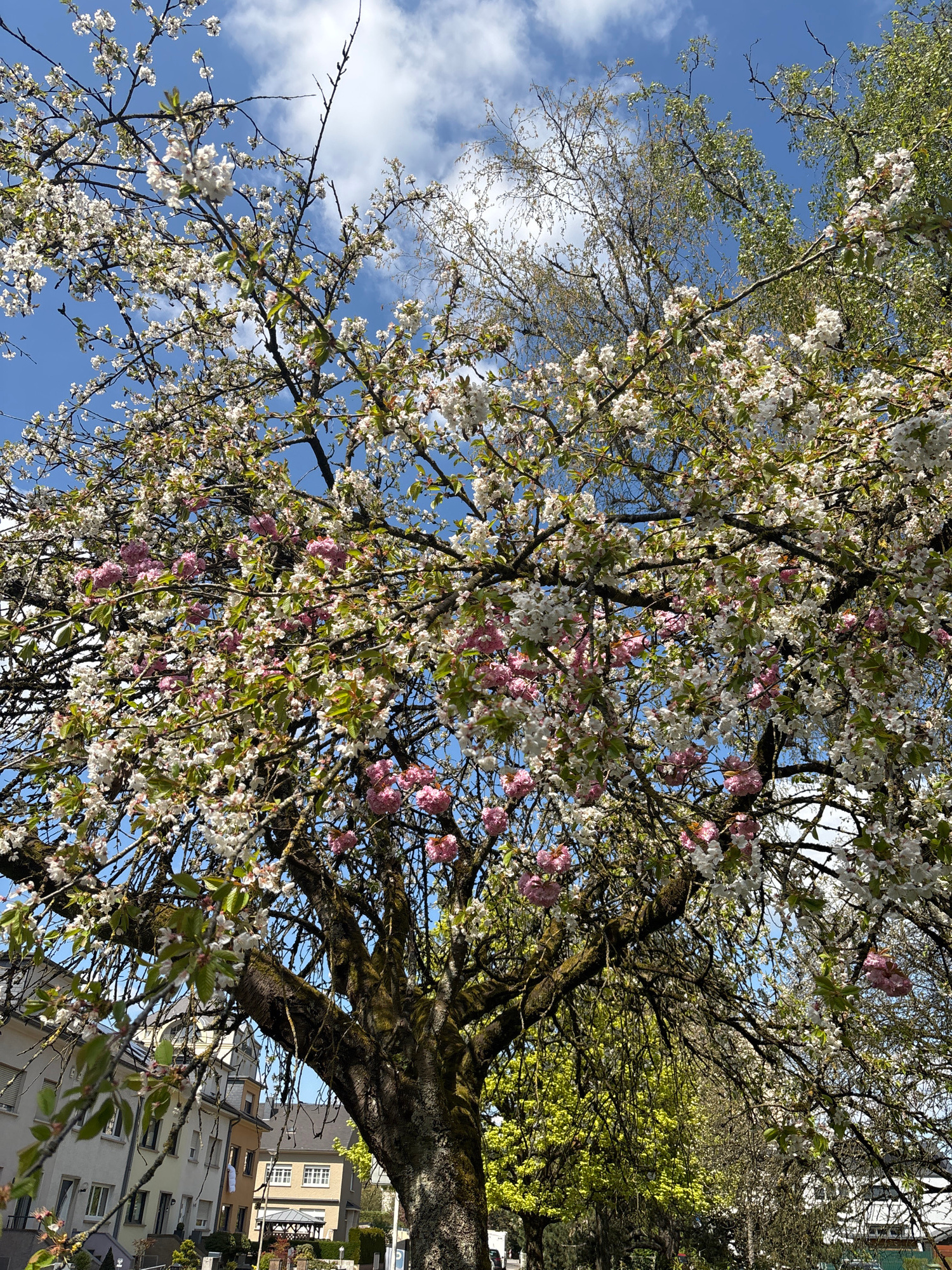 The image shows a view looking up into a tree in full bloom with white and pink flowers. The branches fill most of the frame, with glimpses of a blue sky with wispy clouds visible through the foliage.…read more