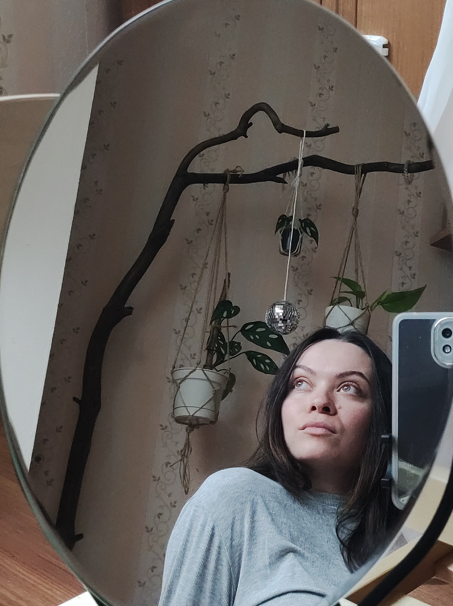 A reflective oval mirror reveals a woman's self-portrait. She is looking upwards with her eyes open. Her shoulder-length dark hair frames her face, and she is wearing a gray long-sleeved shirt. The re…read more