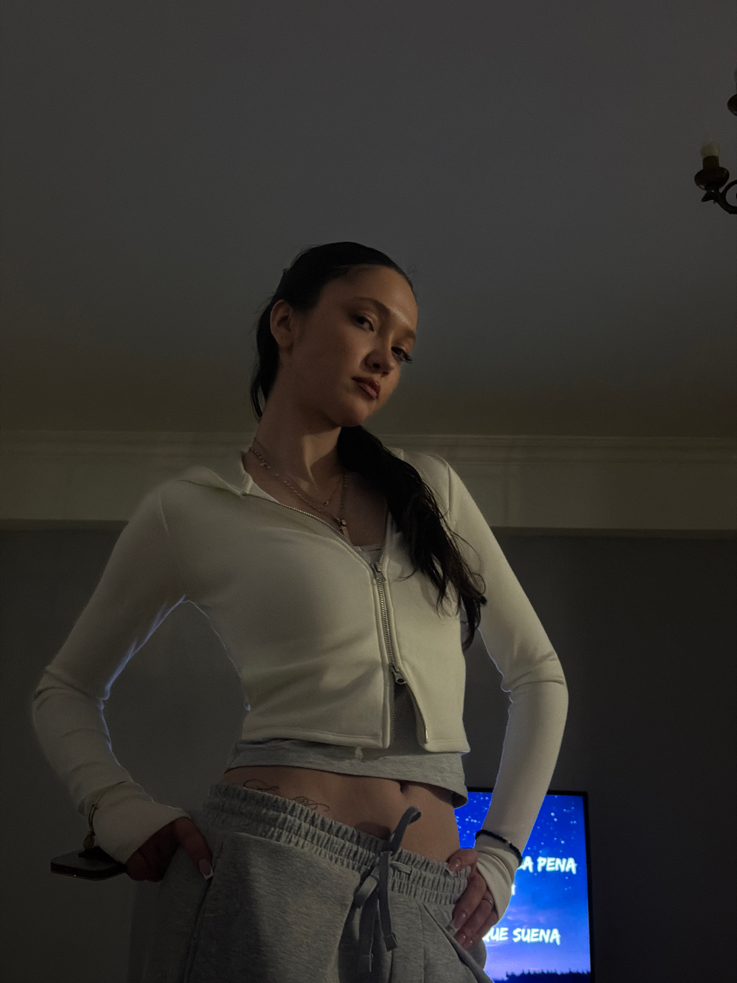 A woman is posing indoors, turned at an angle to the camera. She has dark hair pulled back, and is wearing a white long-sleeved zippered jacket and gray sweatpants. The background includes a TV screenβ¦read more