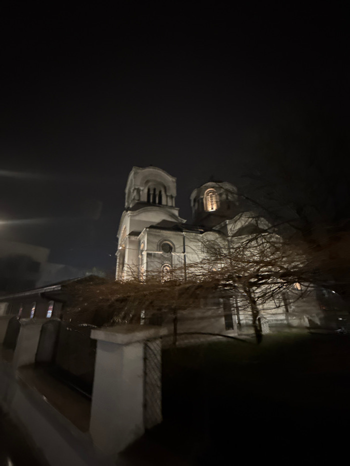 A nighttime shot reveals a grand, pale building, possibly a church or monument, framed against a dark sky. Architectural details like arched windows and tiers are visible, though partially obscured by…read more