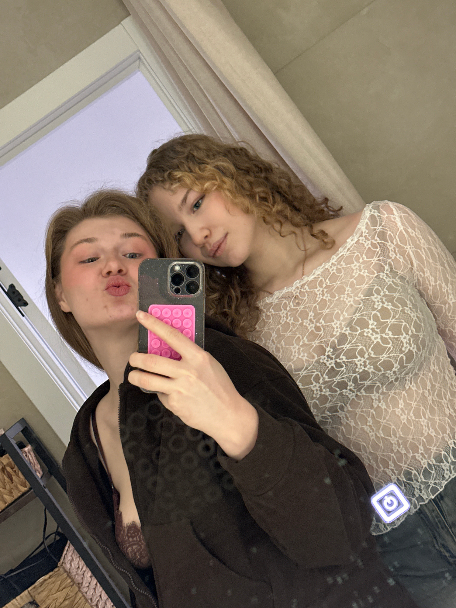 The image depicts two young adult females posing for a mirror selfie indoors. The precise location within Kazan, Russia, cannot be determined from the provided visual information. The female on the l…read more