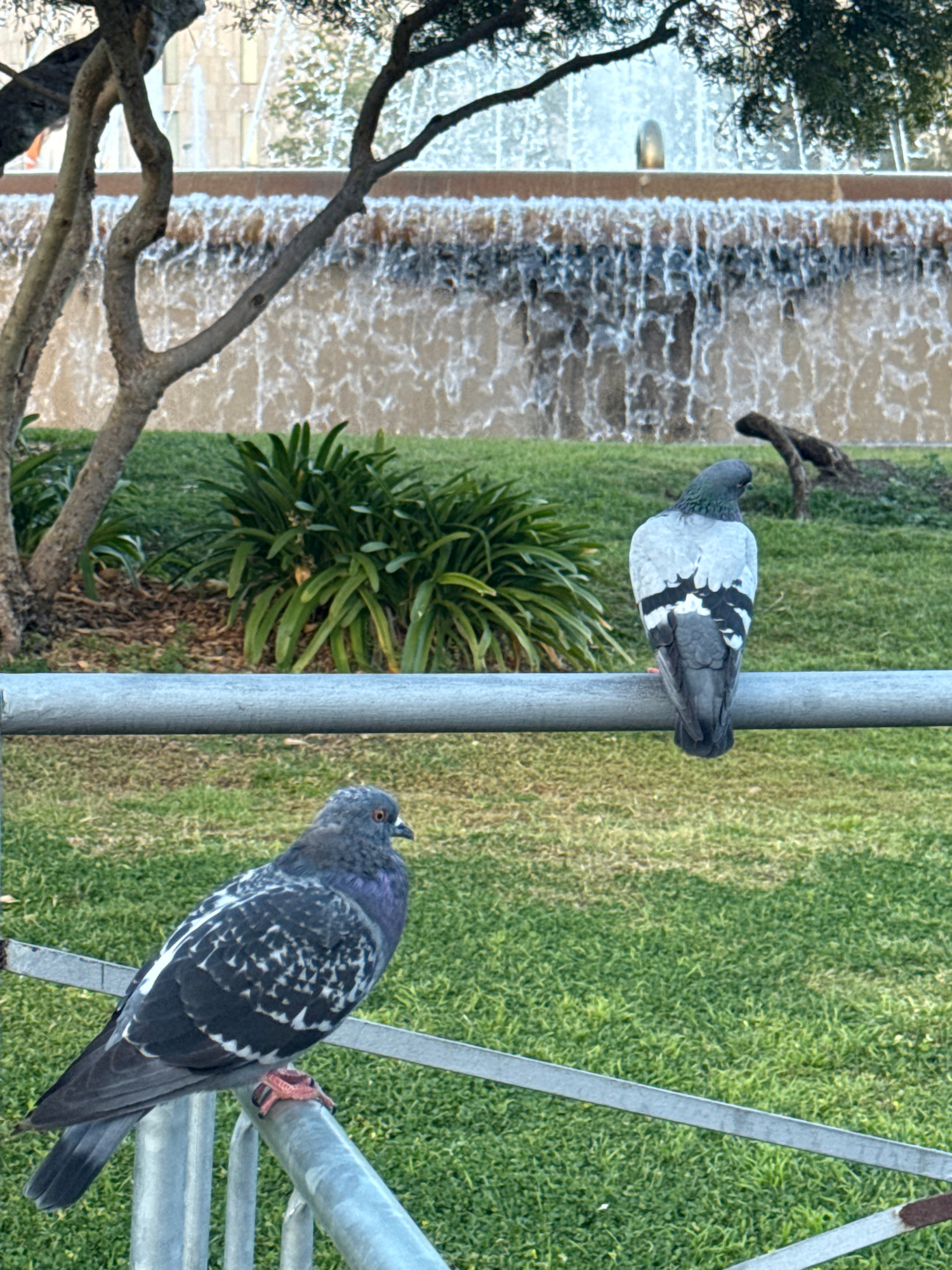 Two pigeons are perched on a metal structure in an outdoor setting. One pigeon is seated higher and further away than the other. The other pigeon faces toward the first pigeon. The location appears to…read more