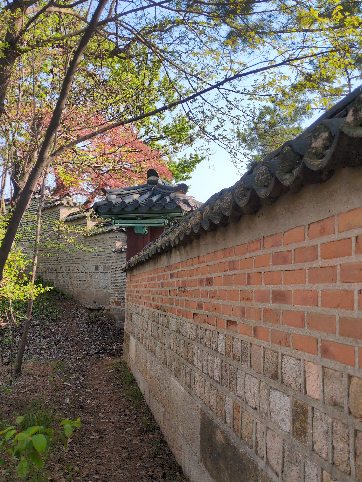 The image shows a brick wall with a traditional Korean roof along the top. The wall has two distinct sections: the top section is made of red bricks, and the bottom section is made of gray stones. The…read more