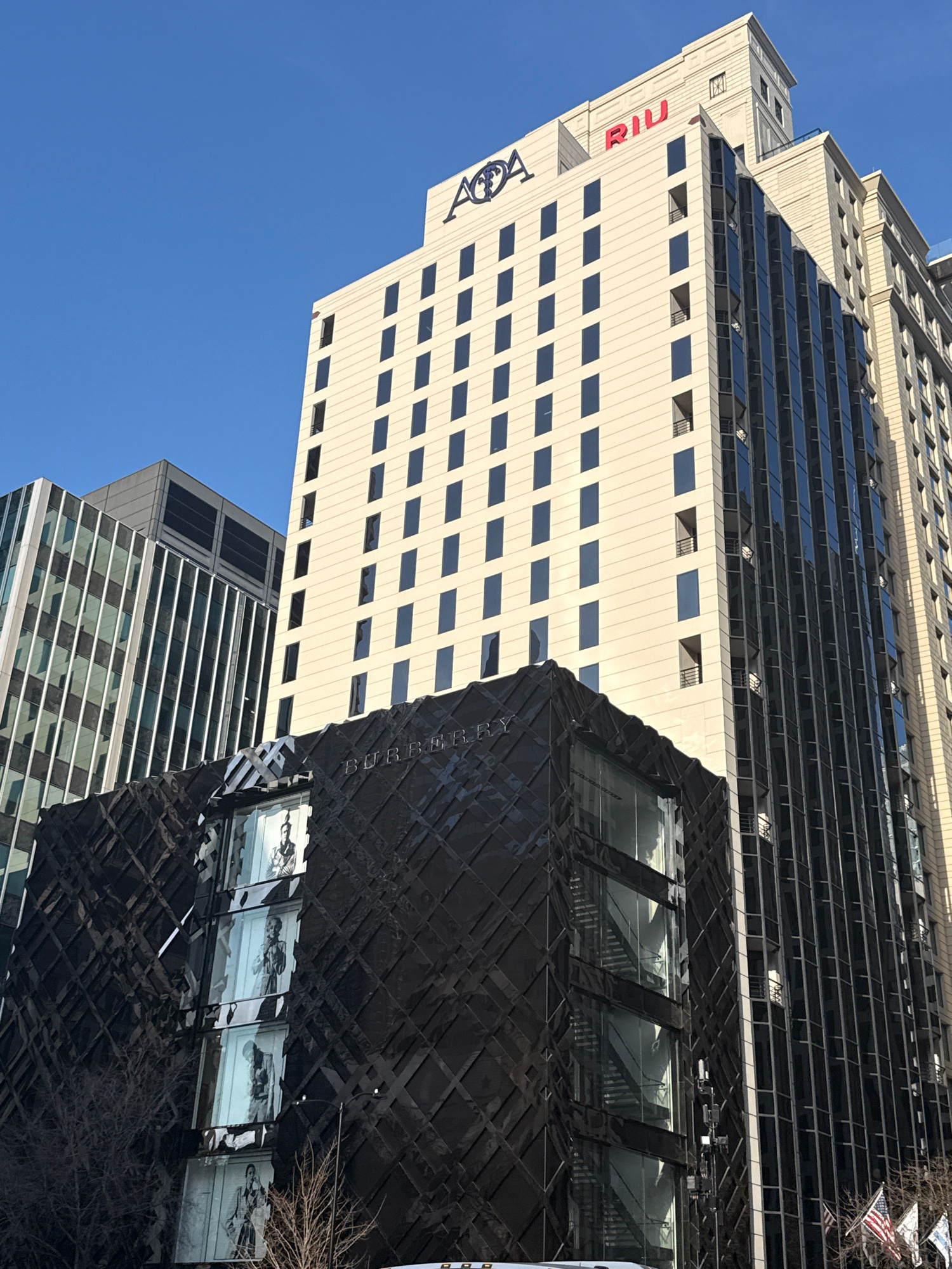The image shows a view of buildings in Chicago, United States. A building with "RIU" and "AOA" written on it is visible, as well as a building with a black, textured facade, with "BURBERRY" visible onβ¦read more