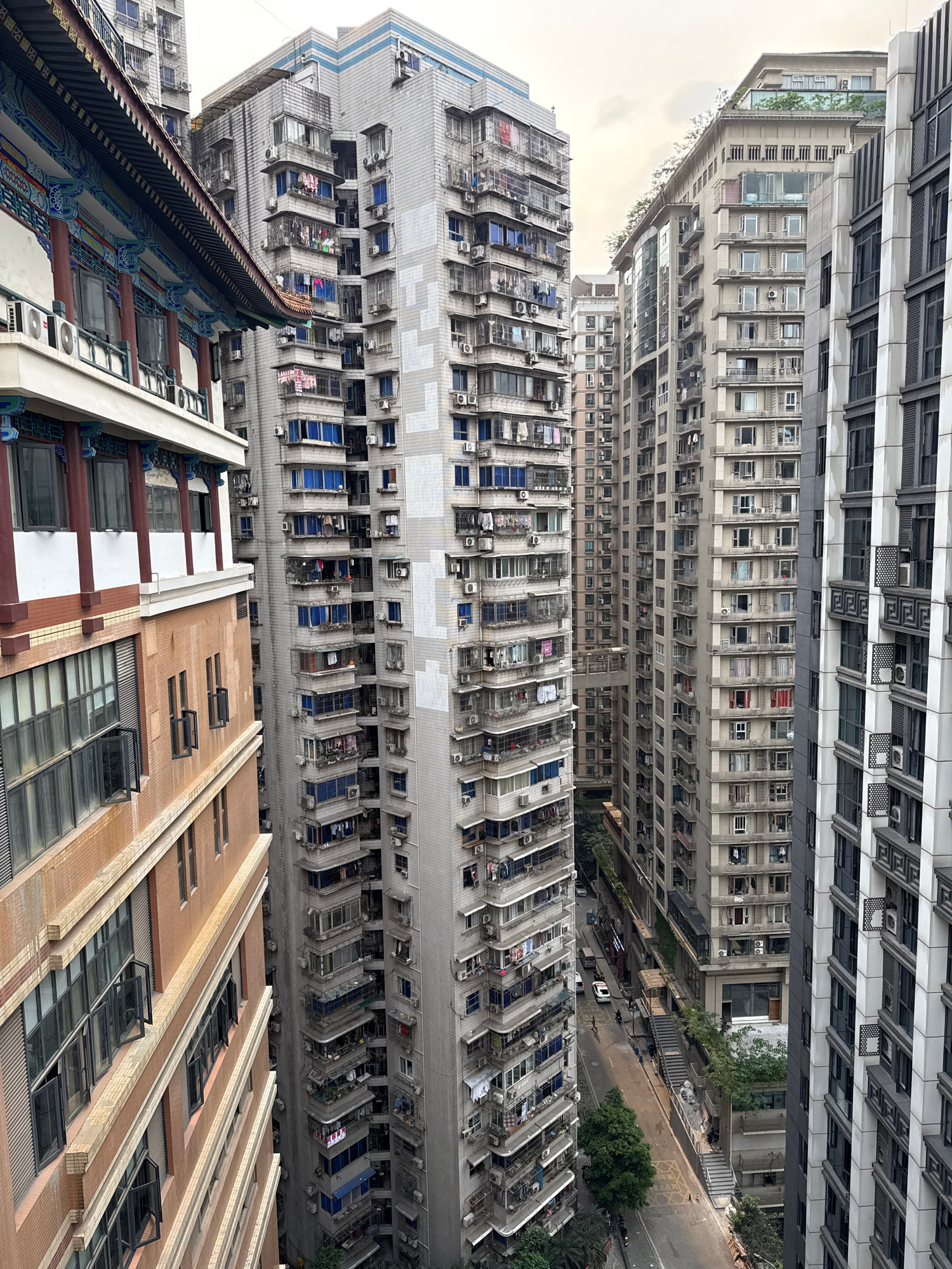 The image shows a high-angle view of densely packed residential buildings in Yuzhong District, China. The buildings vary in height and architectural style, ranging from older, tiled structures with tr…read more