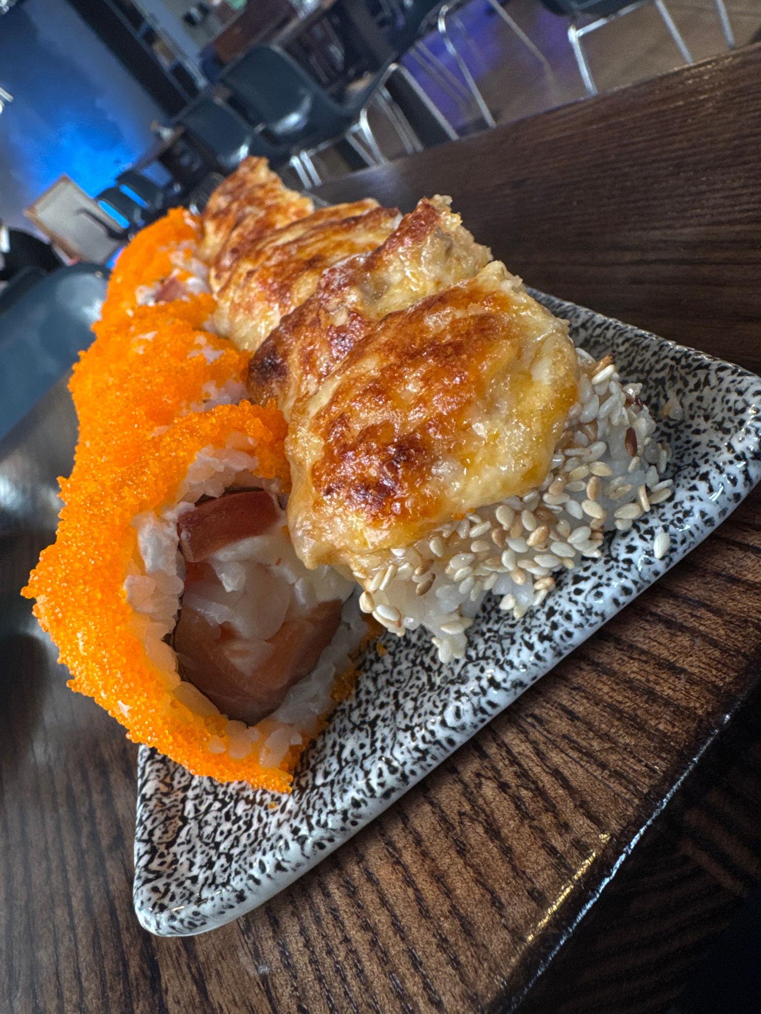 The image shows a plate of sushi. The sushi consists of a roll covered in orange roe, filled with white rice and what appears to be salmon or tuna, topped with a piece of cooked fish. The plate is tri…read more