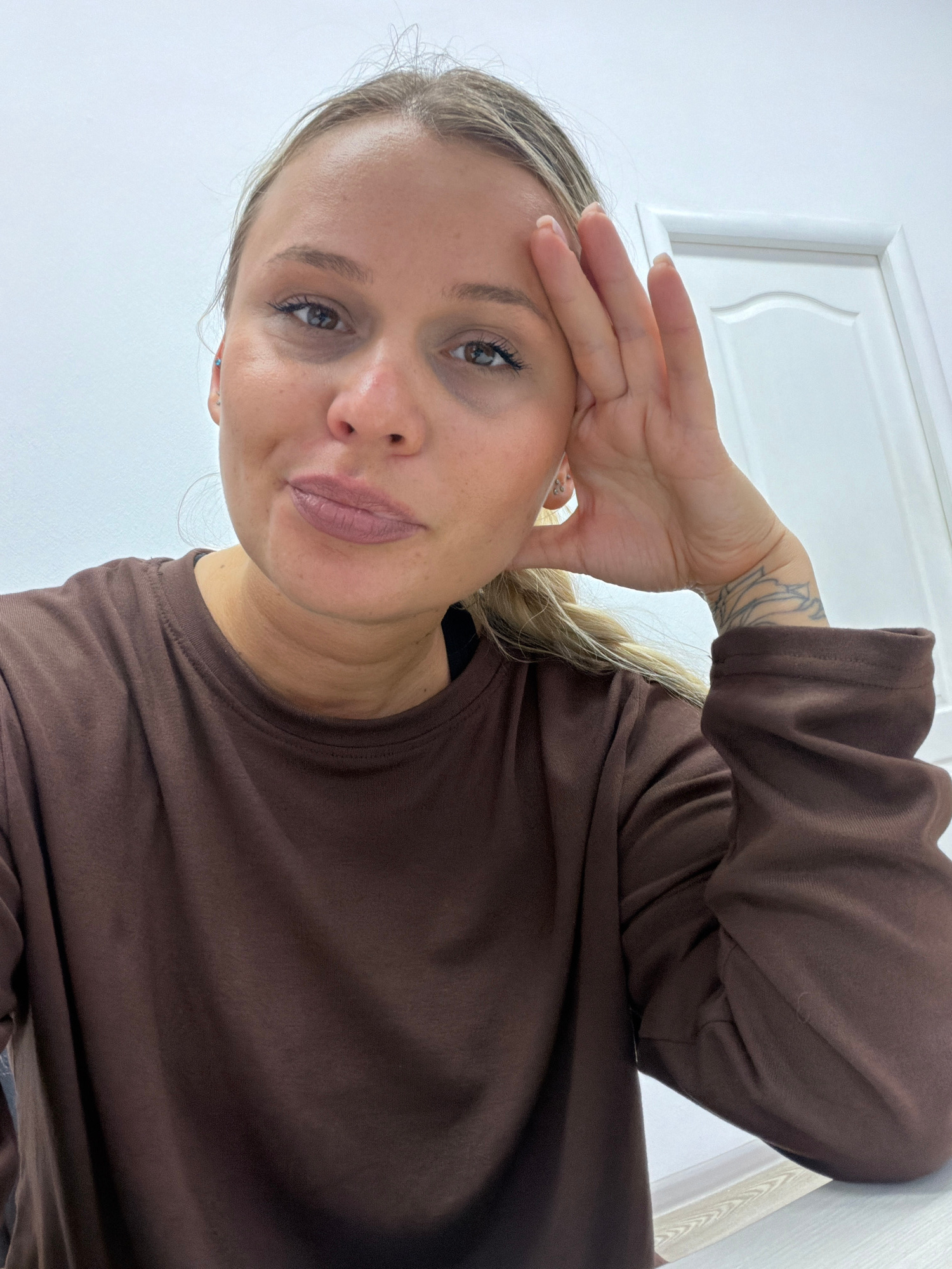 A woman with blonde hair pulled back and wearing a brown long-sleeved shirt is looking down at the camera, her right hand on her forehead. The background is a white wall with a white door in the upper…read more
