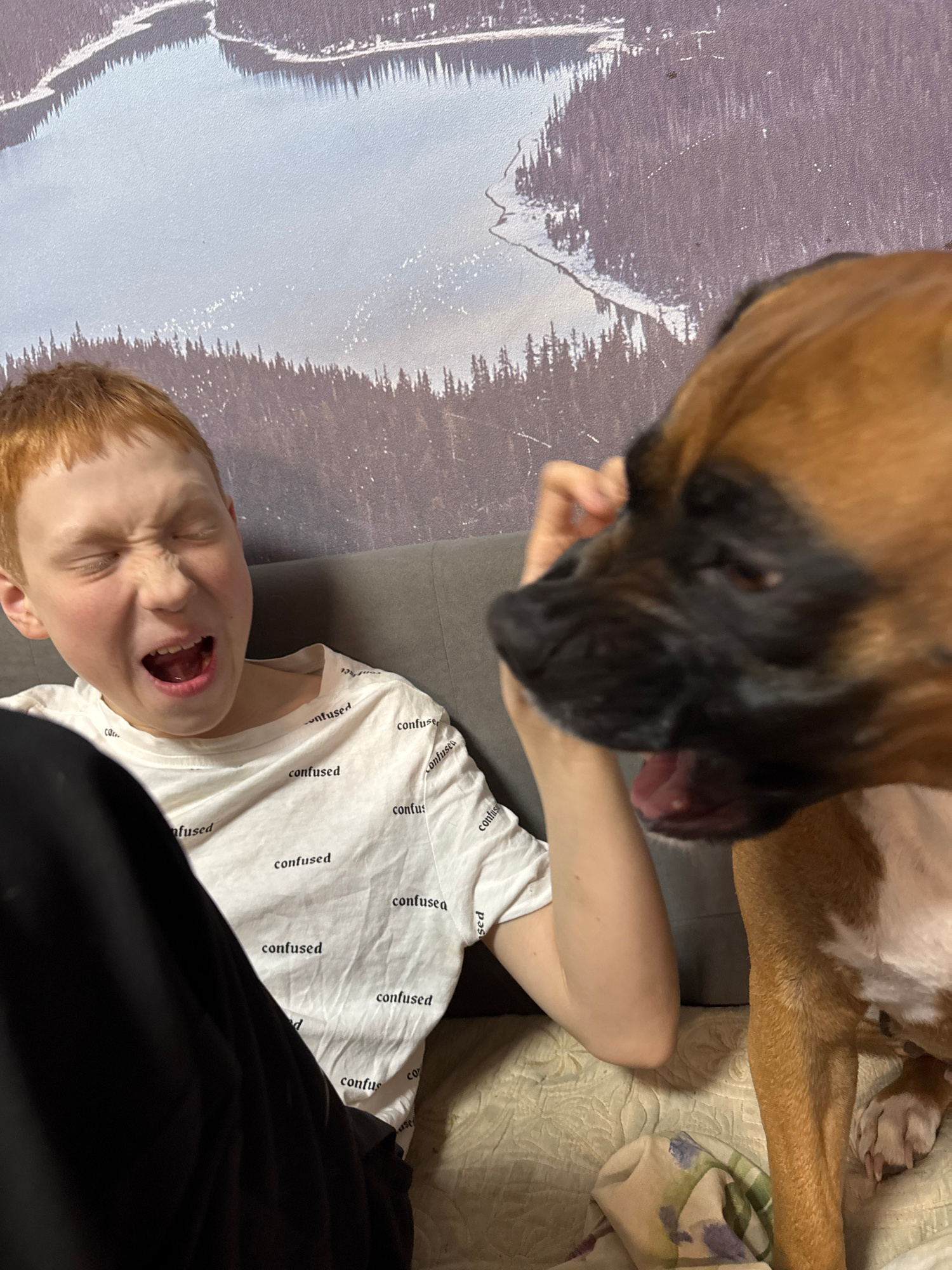A boxer dog leans over a young red-haired boy lying on a couch wearing a white t-shirt. The boy is looking upward, his eyes closed and mouth open. The couch is gray, and a blanket is visible behind th…read more