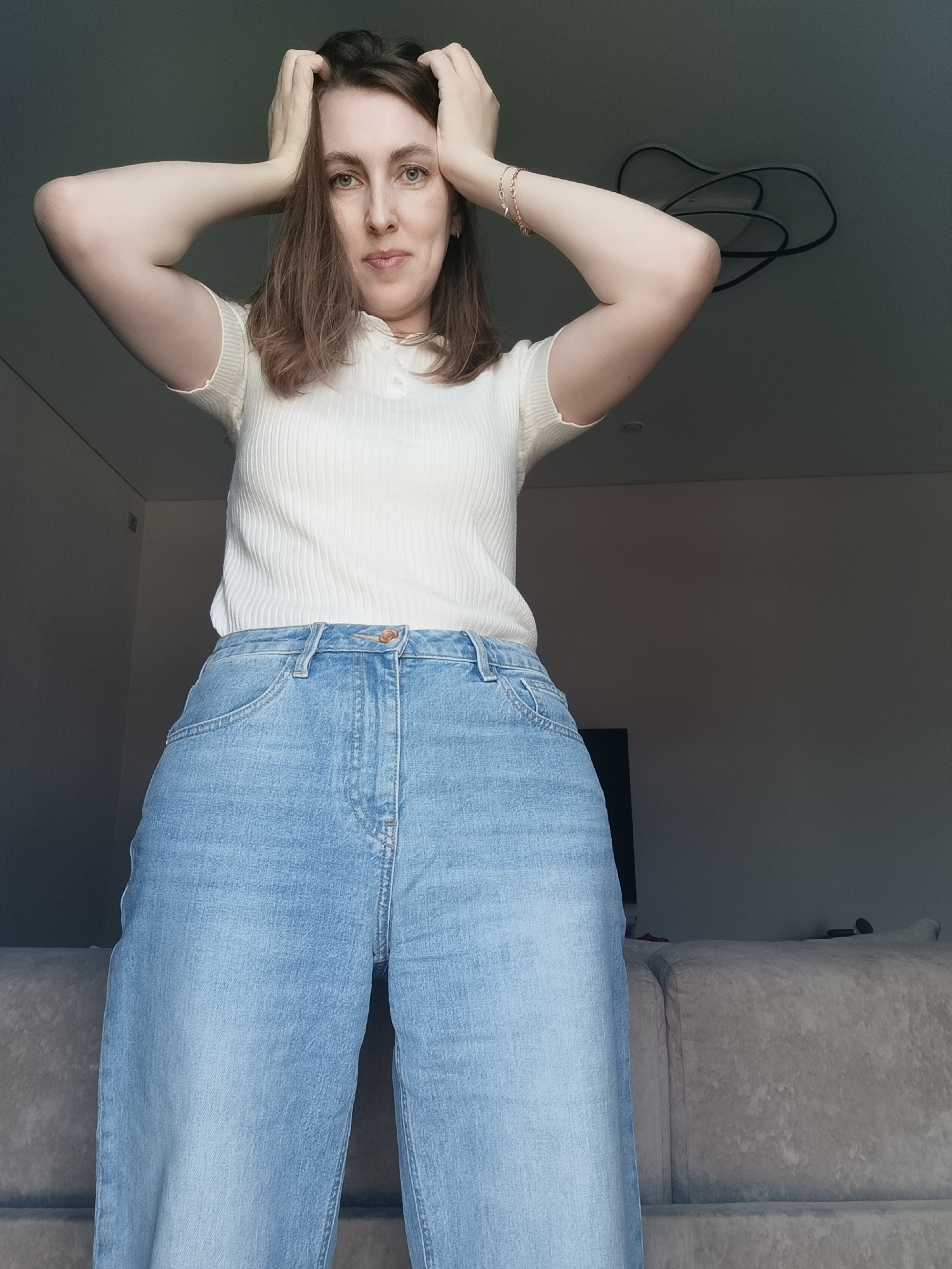 A woman stands indoors, facing the camera, with her hands on her head. She wears a cream-colored ribbed top and light blue wide-leg jeans. A couch is visible in the background, along with a television…read more
