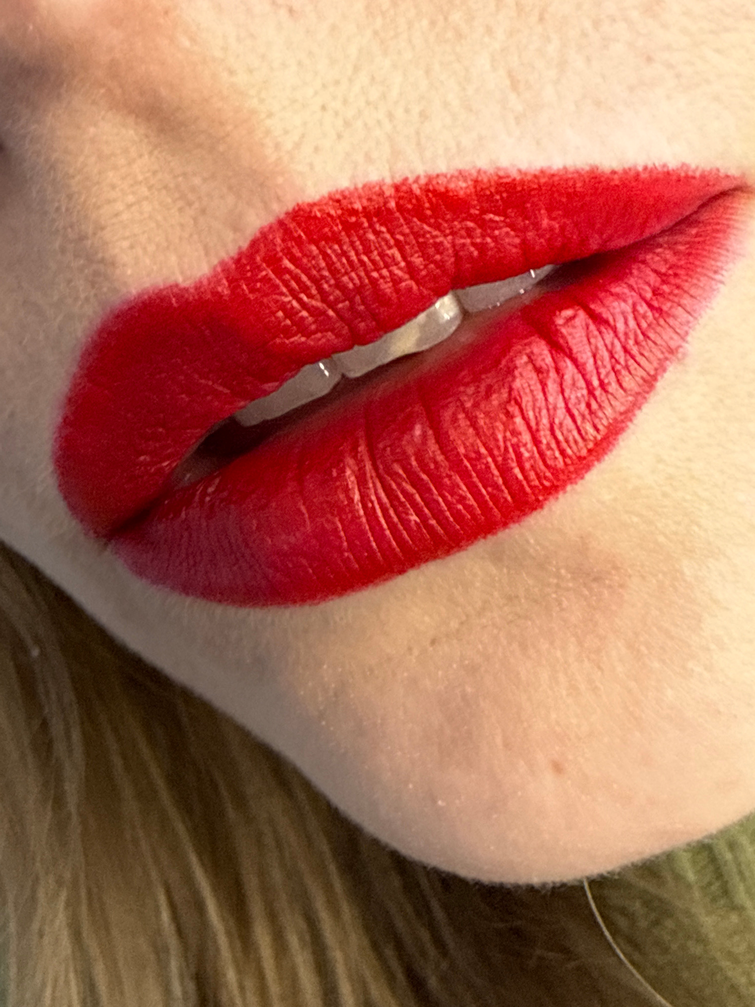 A close-up photograph depicts a person's lips adorned with bright red lipstick. The teeth are slightly visible between the lips. The skin around the mouth is pale, and some hair is visible near the chβ¦read more