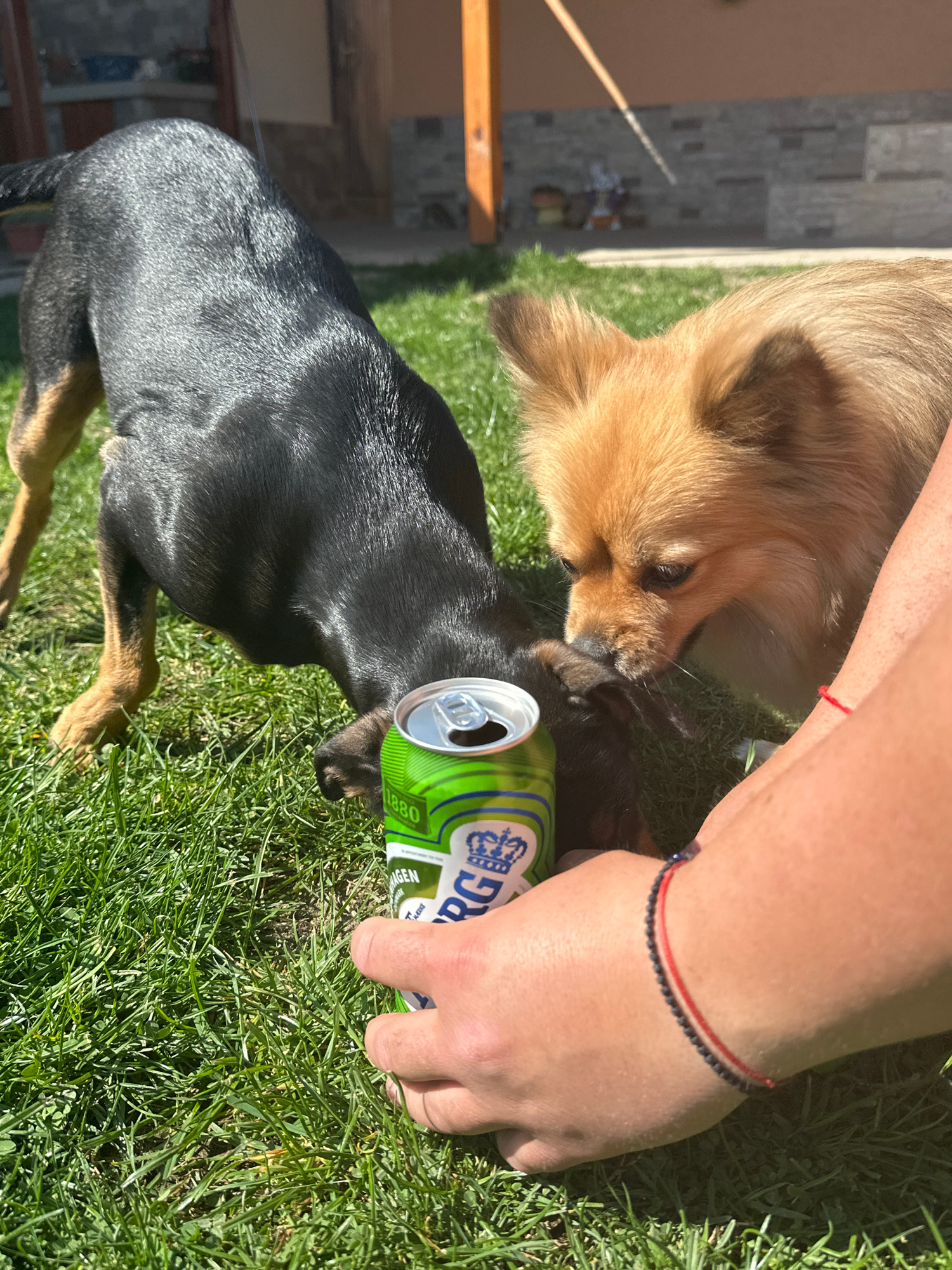 The photograph shows two dogs, a tan Pomeranian-like dog and a black and tan Doberman-like dog, in an outdoor grassy area, along with a hand holding a green beer can. The can is labeled with "Birg" an…read more