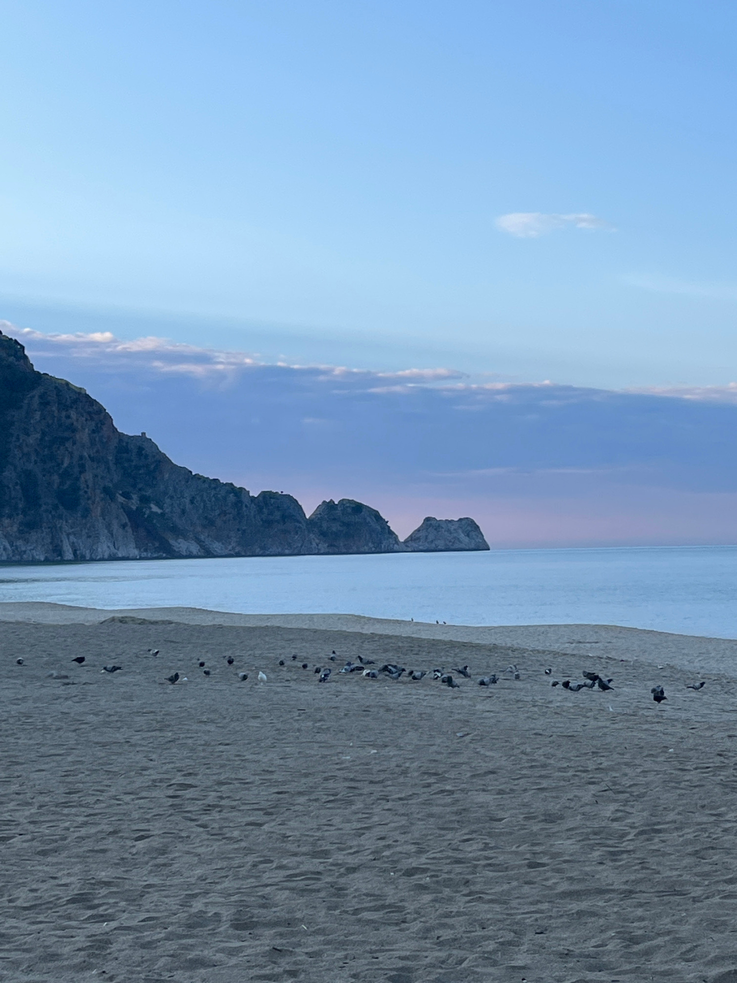 The image captures a coastal scene in Alanya, Turkey, during twilight. The foreground is a sandy beach, light grey-brown in color, populated by approximately 30-40 pigeons of varying grey, black, and…read more
