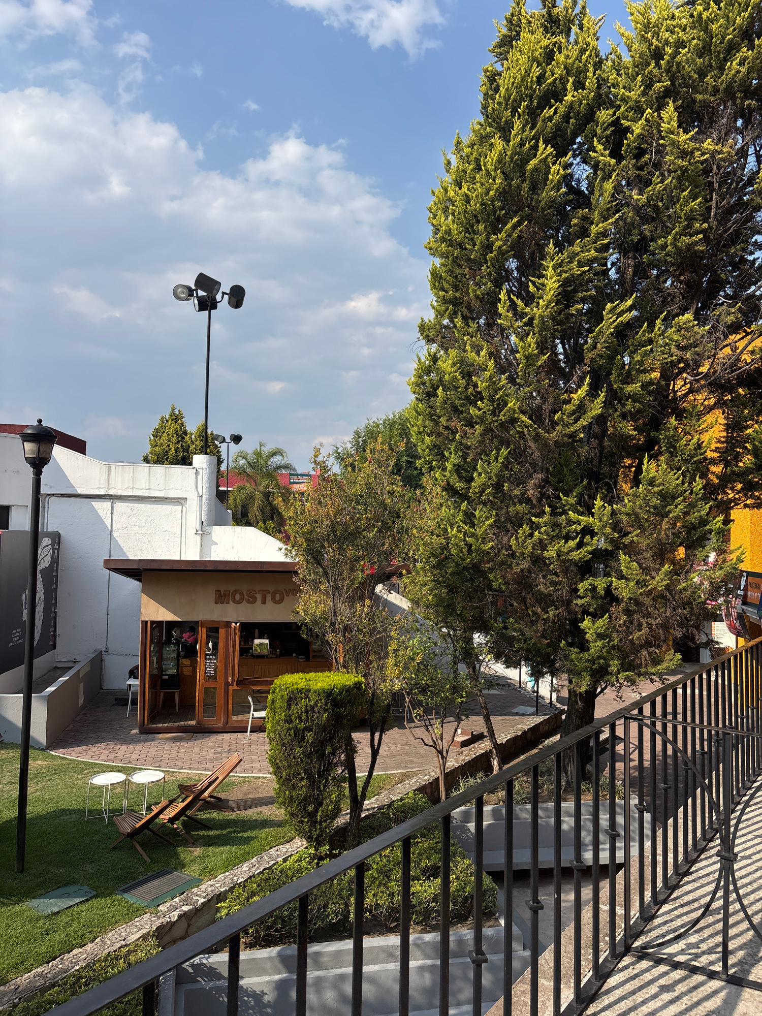 The image captures the "Mostovoi San Andrés" establishment in San Andrés Cholula, Mexico. The building is a white, single-story structure with a brown awning. The name "MOSTOVOI" is vertically display…read more