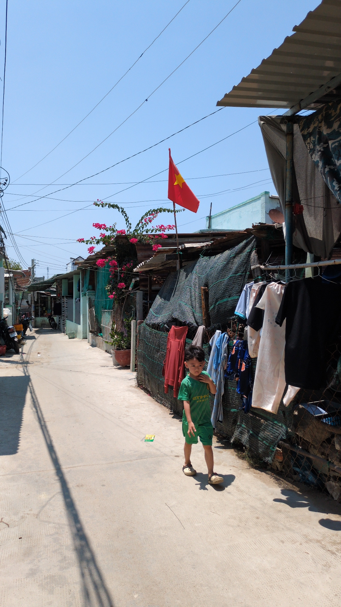 A street scene in Phan Rang – Tháp Chàm, Vietnam. The photo is taken in a narrow street. A child in green clothing stands on a concrete street. Behind him is a residence with clothes hanging on a make…read more