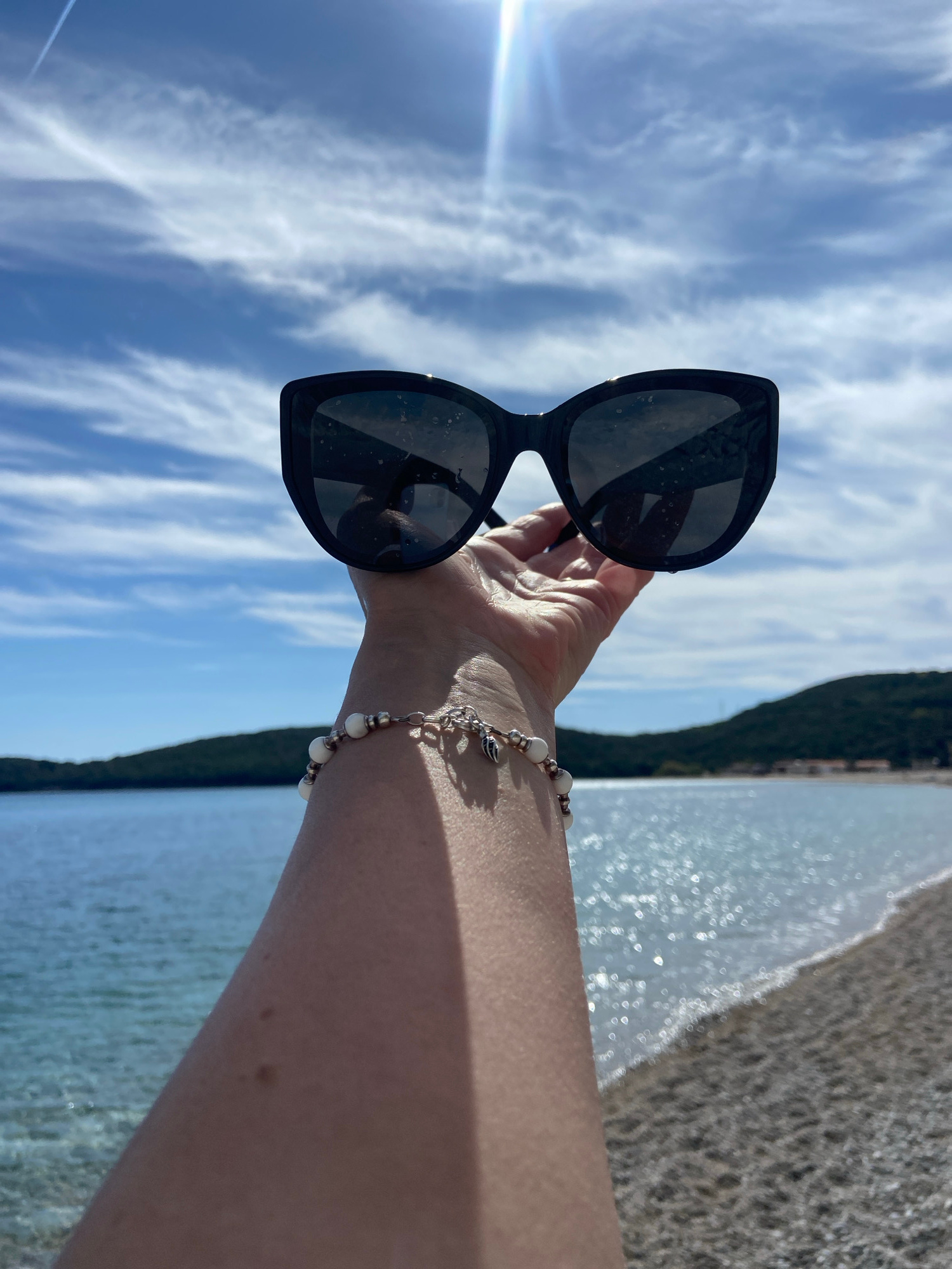 A person holds sunglasses over a view of the Bay of Kotor in Prijevor, Montenegro. The sunglasses are dark-framed, with visible smudges on the lenses. The person's hand and forearm, adorned with a bea…read more
