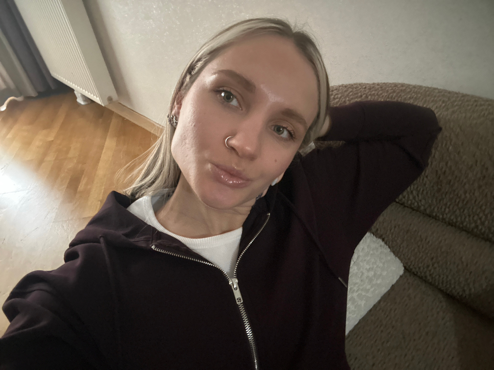 A young woman with blonde hair and a nose ring is centered in the image. She is wearing a dark maroon zipper jacket over a white top. The background includes a wooden floor, a white radiator, and beigβ¦read more