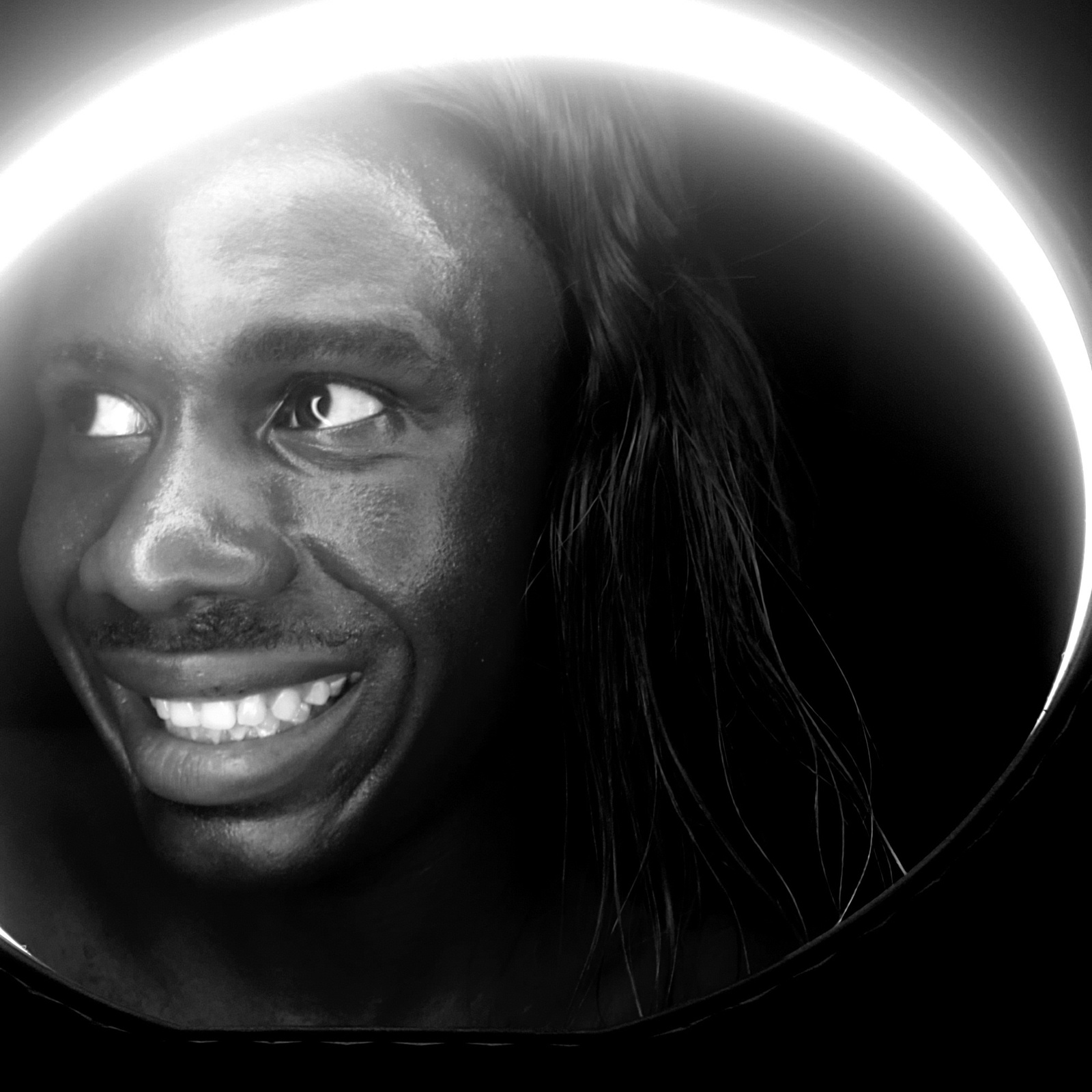 A black and white photograph, rotated counter-clockwise, shows a person with dark skin facing the camera and smiling, teeth visible. The person has short, dark hair. A ring of bright light surrounds t…read more