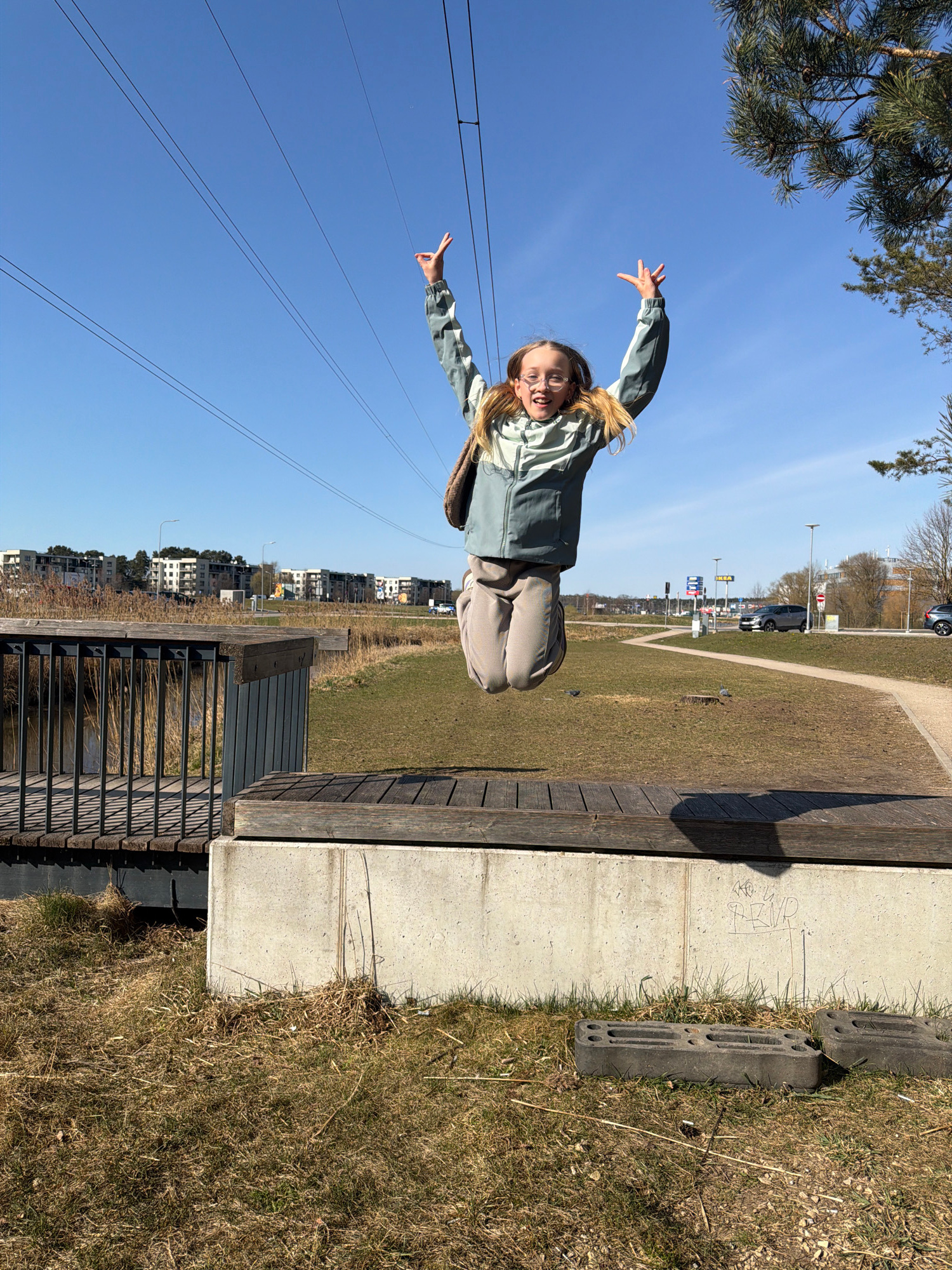 A girl with blonde hair wearing glasses and a light green jacket is on a zipline, with her arms outstretched. The zipline is in a park in Ulbroka, Latvia. The park has a grassy area, a concrete walkwa…read more