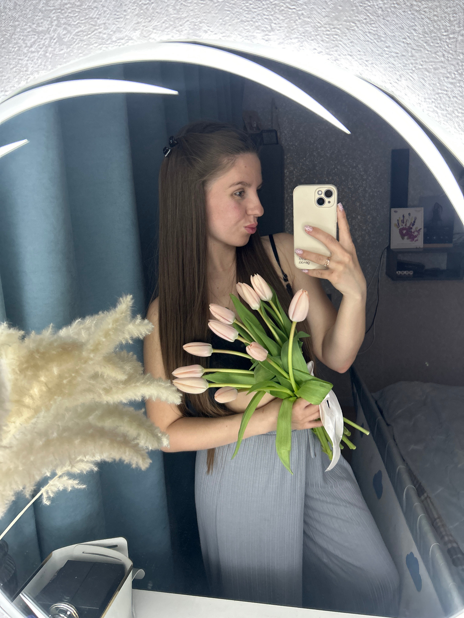 A young woman is reflected in a ring light mirror while taking a selfie with her smartphone. She is holding a bouquet of light pink tulips with green stems and leaves in her left hand. She has long br…read more