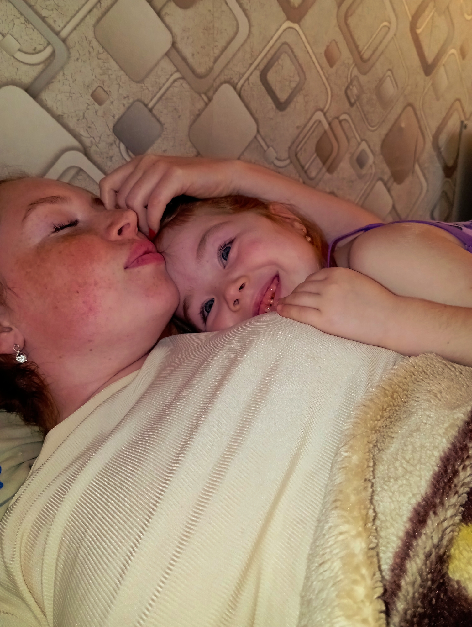 Two people, a woman and a child, are lying on a surface with patterned tile. The woman has freckles and an earring, and her eyes are closed. The child, with light-colored eyes, is smiling and looking…read more
