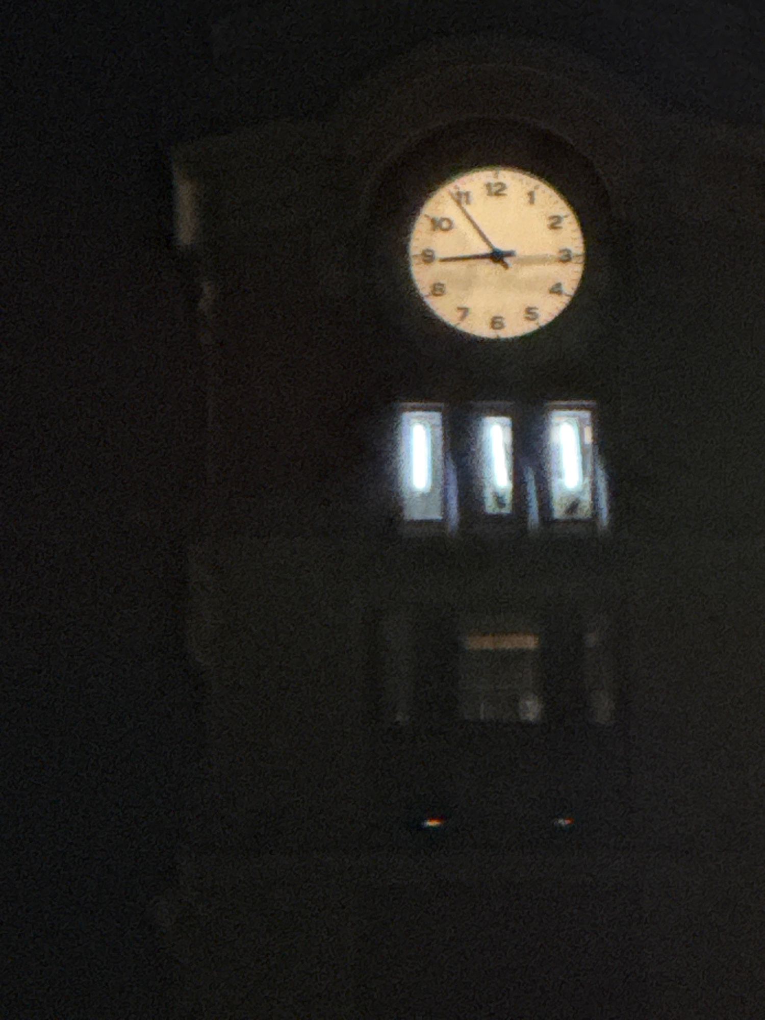 The image shows a dimly lit exterior scene at night. On the left, there is a round clock with a light-colored face and black numerals, showing the time around 8:18. To the right of the clock, there is…read more
