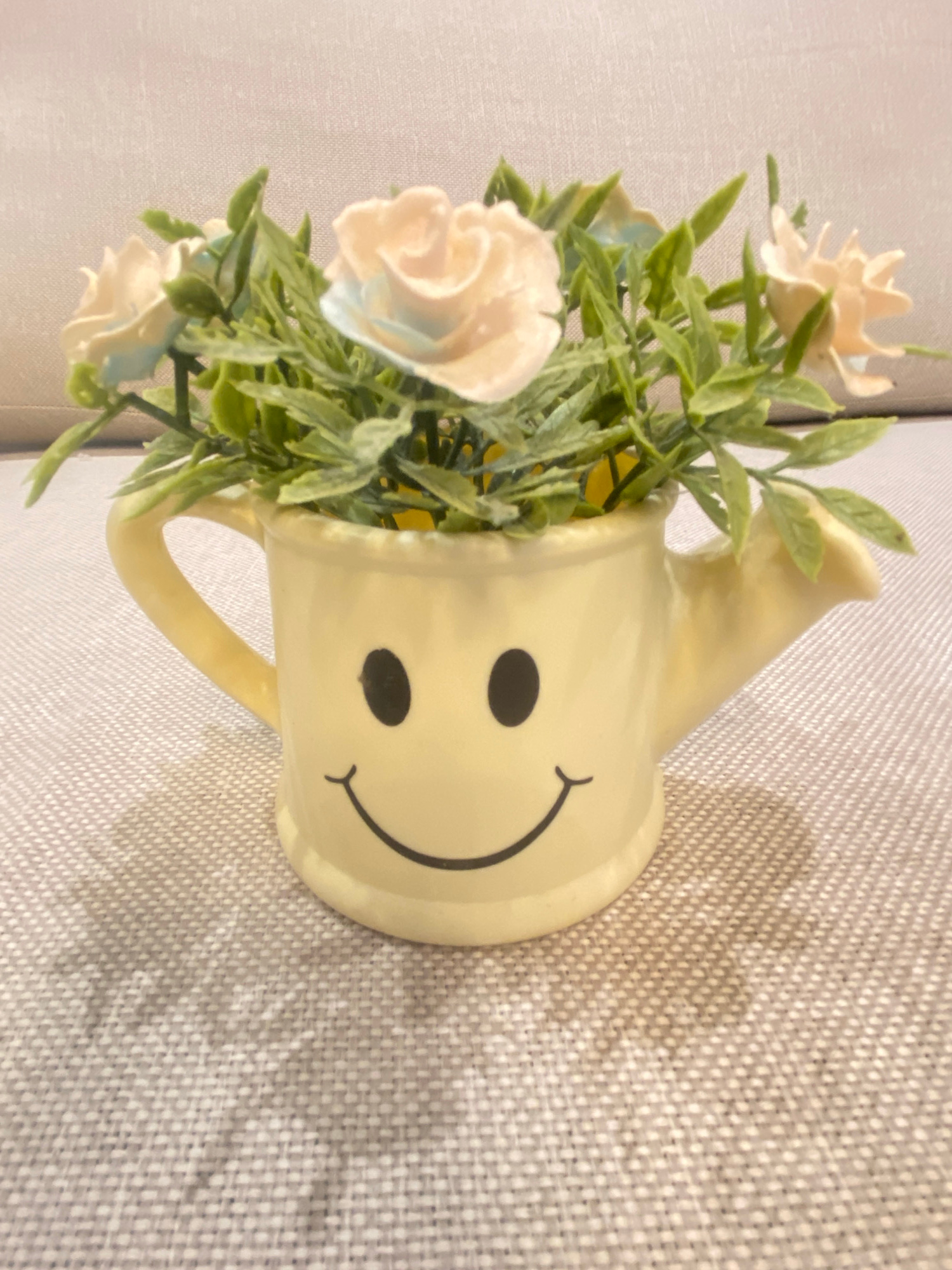 A slightly off-center, overhead shot displays a small, light yellow watering can-shaped container with a simple smiley face drawn on its front. The container holds artificial plants with small white r…read more