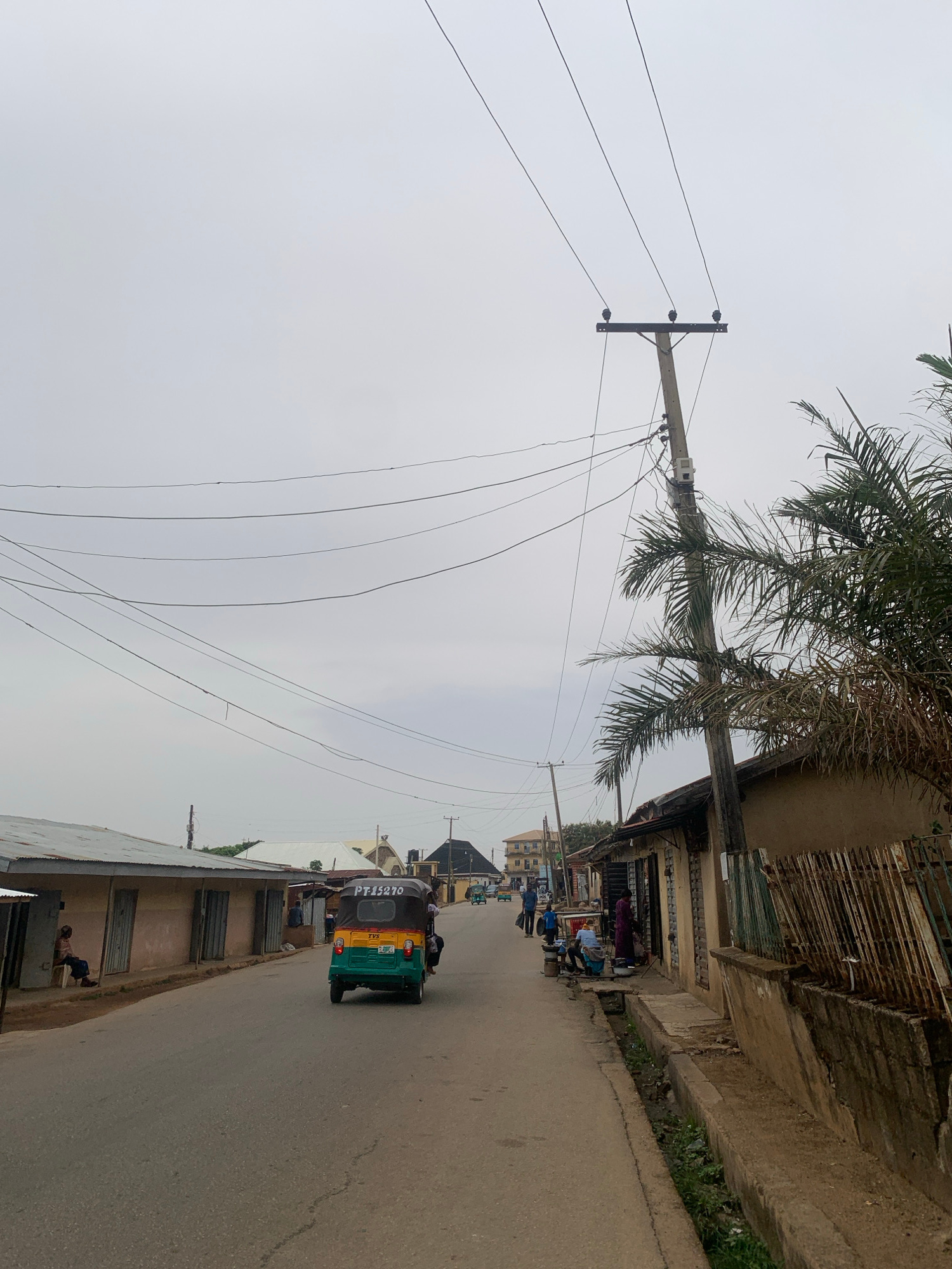 The image depicts a street scene in Jos, Nigeria, observed from a slightly elevated position. A paved road stretches into the distance, where buildings are visible. An auto-rickshaw, painted green, ye…read more