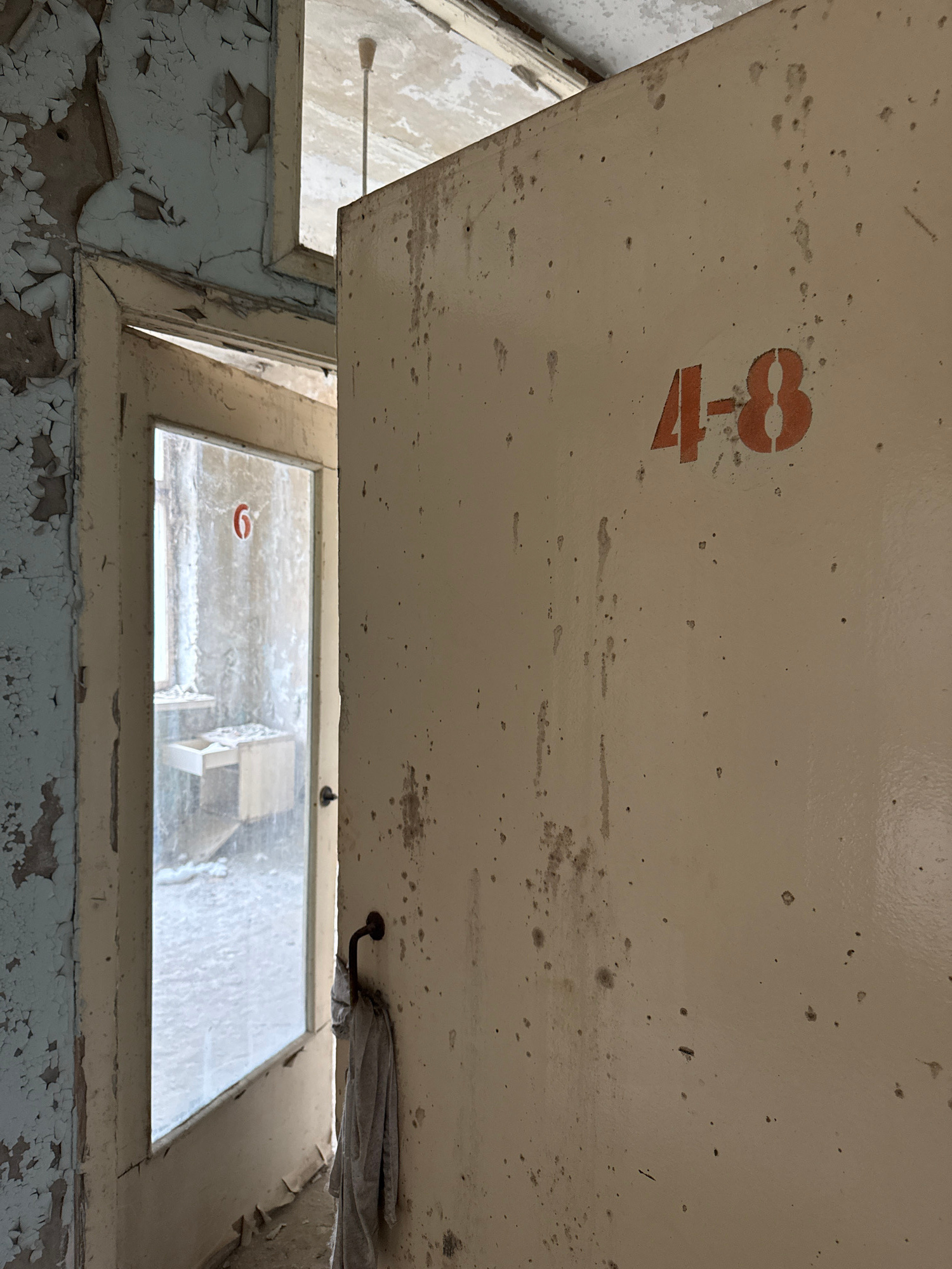 The image depicts a decaying interior, likely in a building located in Prypiat, Ukraine, based on the state of disrepair and architectural style. The primary focus is on a cream-colored ceiling or ove…read more