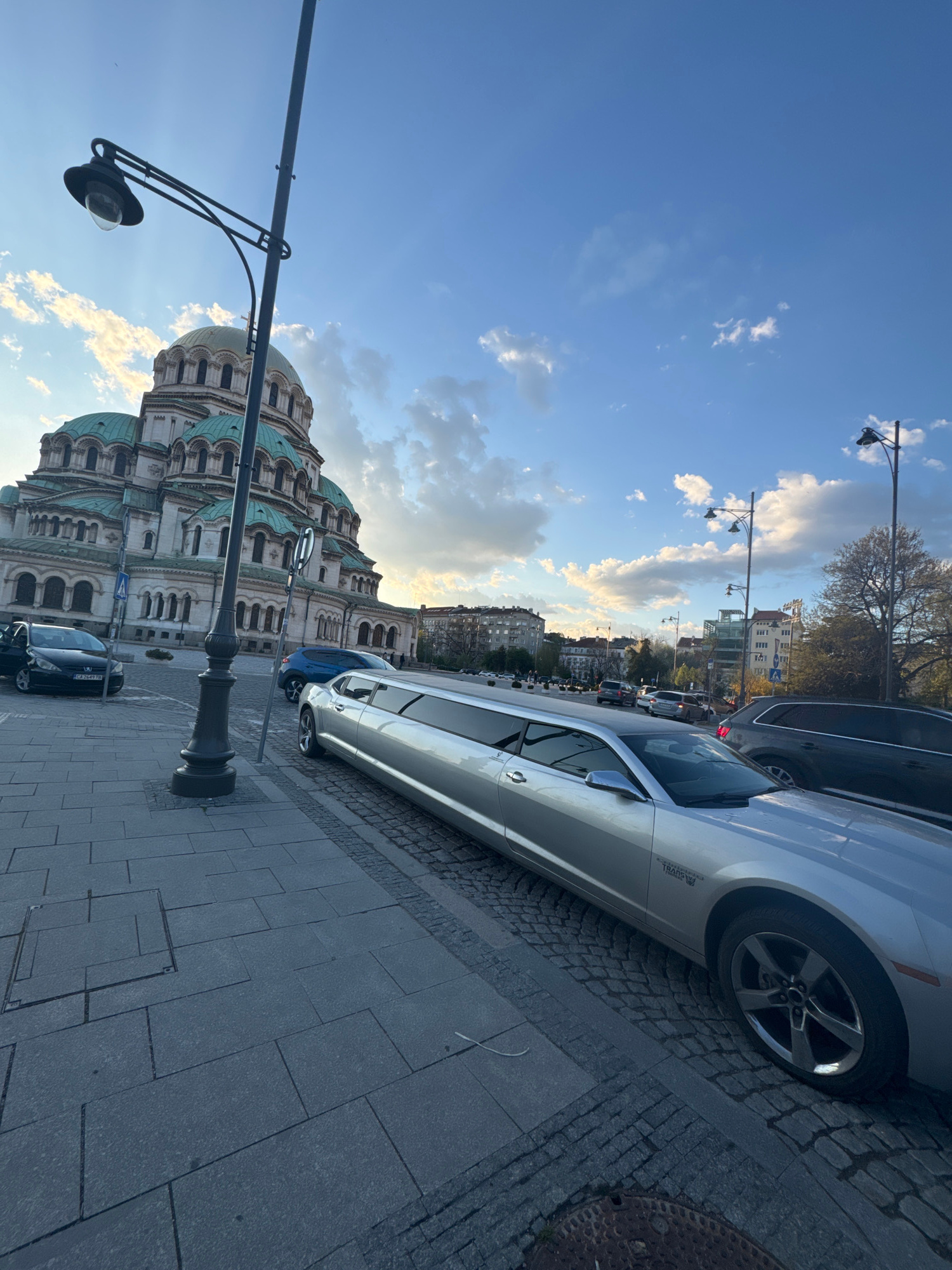 The image shows the Alexander Nevsky Cathedral in Sofia, Bulgaria, viewed from street level. A street lamp is visible in the foreground, partially obscuring the lower section of the cathedral. Cars ar…read more