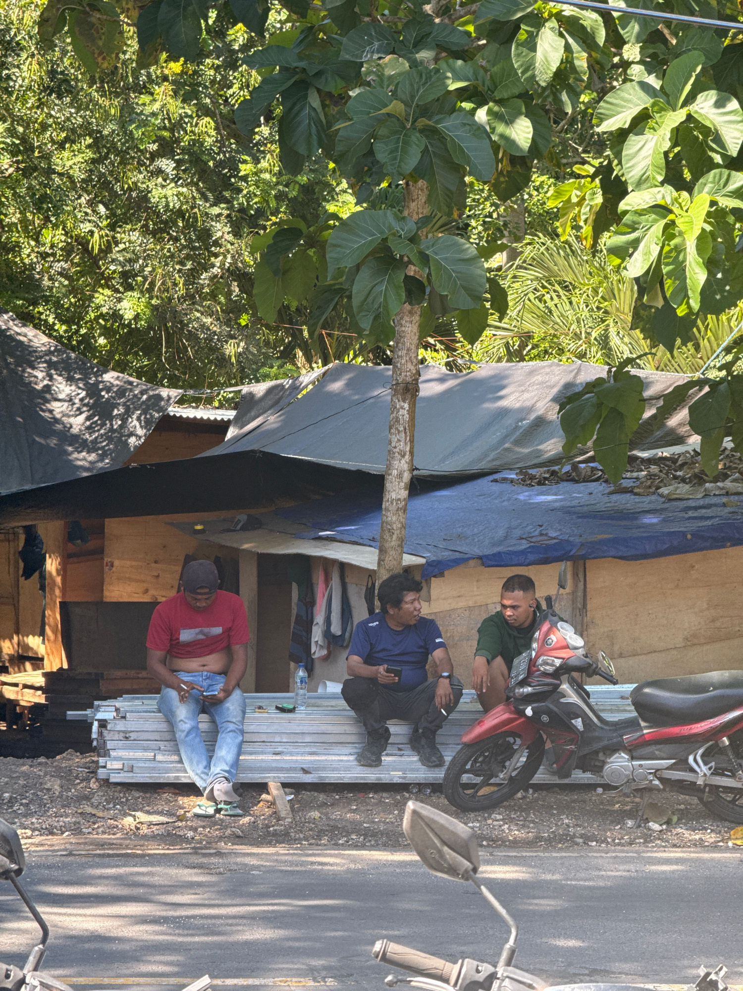 The image, taken in Kuta Selatan, Indonesia, shows three men alongside a road. One man, wearing a red shirt, blue jeans, and a dark cap, is lying on a stack of metal construction materials. Another ma…read more