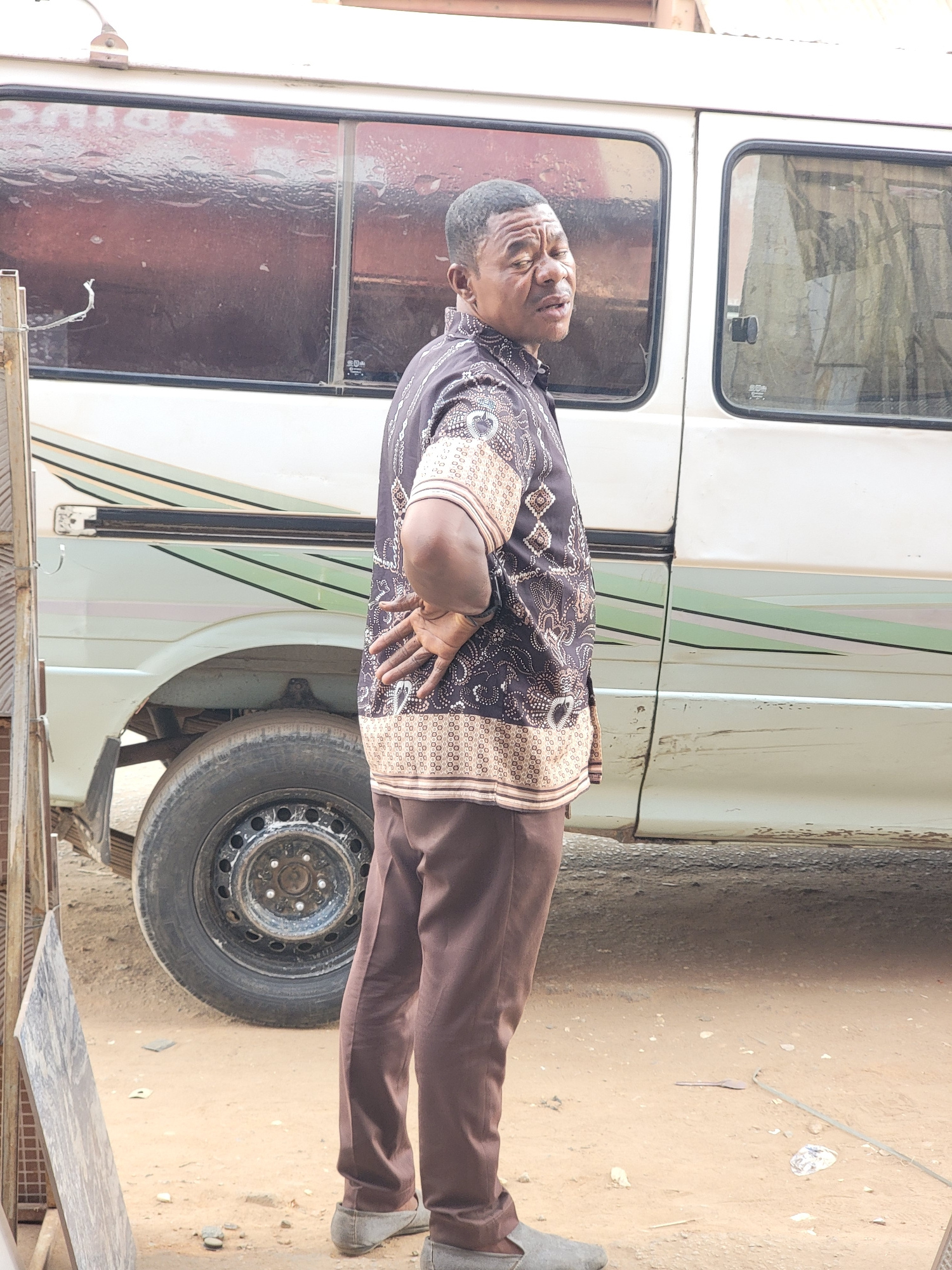 An adult male stands with arms crossed in front of a light-colored van. He wears a patterned brown and beige shirt and brown pants. The location appears to be outdoors, potentially in Maiburiji, Nigerβ¦read more