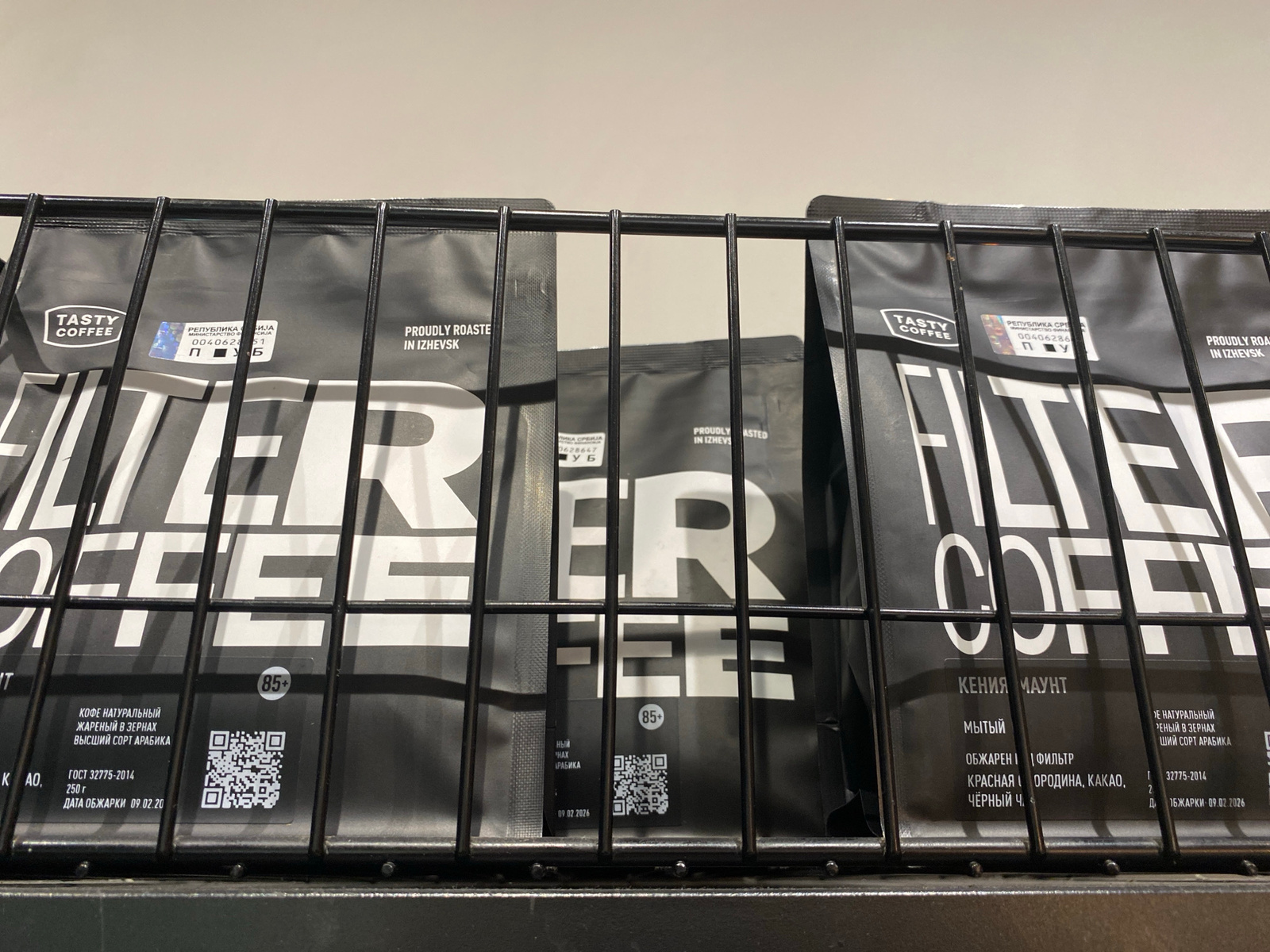 The image shows three bags of "Filter Coffee" on a black metal rack. The bags are black with white lettering. Each bag has the "Tasty Coffee" logo, and a sticker with Serbian text. The text "PROUDLY R…read more