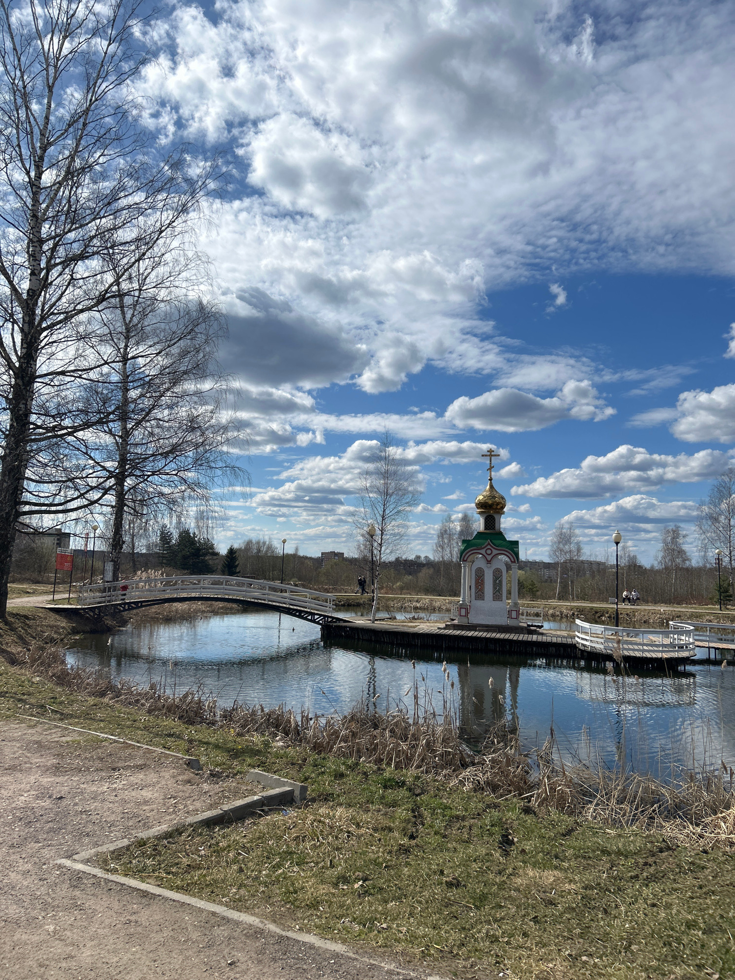 The image depicts a landscape in Klin, Russia, featuring a body of water. A small, decorative Russian Orthodox chapel with a golden dome and cross sits on a wooden platform or small island connected t…read more