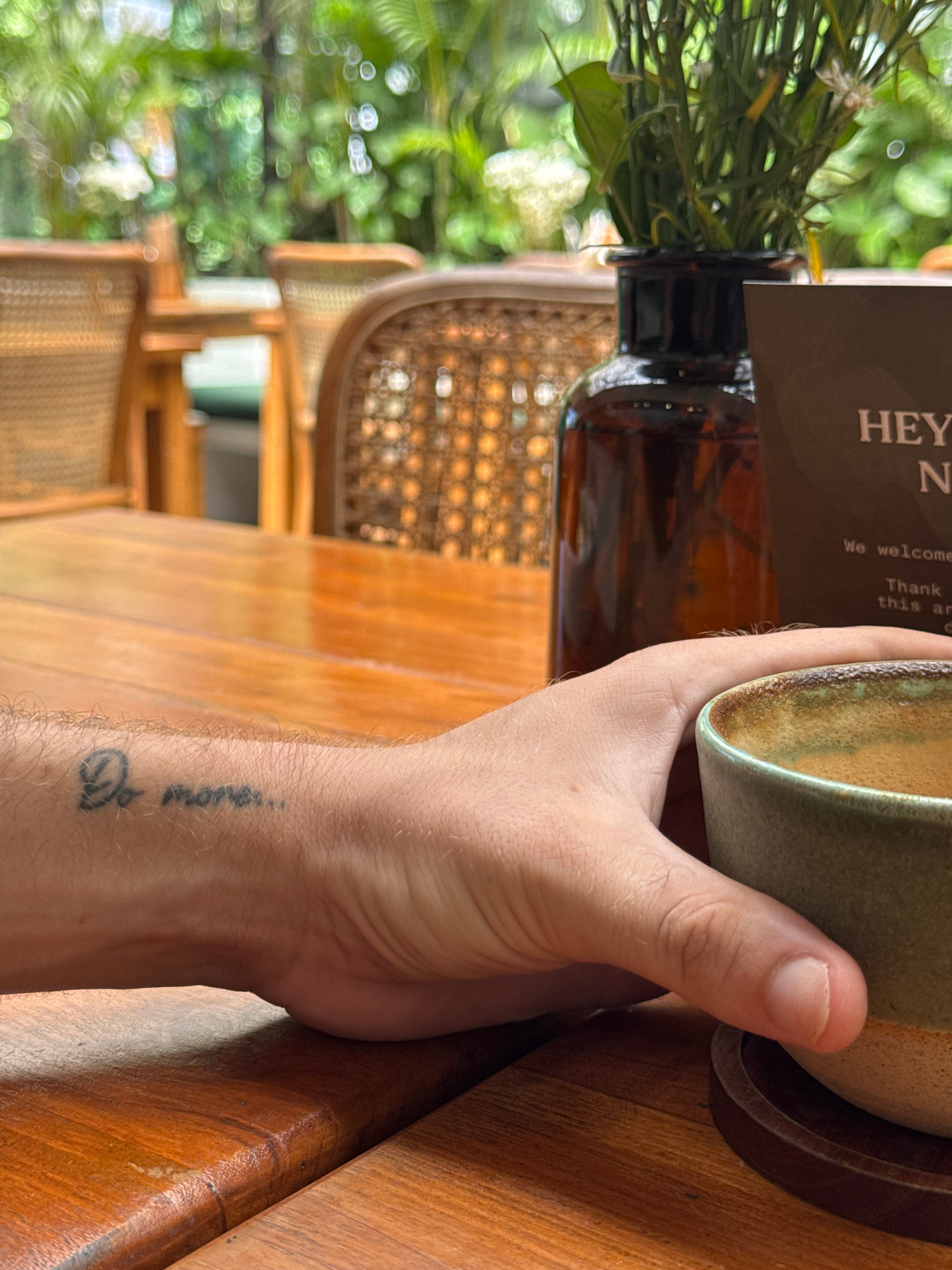 The scene appears to be a table setting at a cafe or restaurant, possibly located in Ungasan, Indonesia, given the tropical-like foliage visible through the blurred background. A fair-skinned hand hol…read more