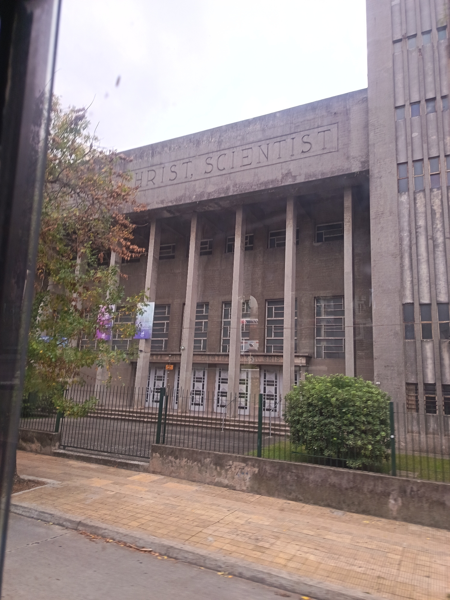 The image shows the First Church of Christ Scientist in Montevideo, Uruguay. It is a large, gray concrete building with "CHRIST SCIENTIST" inscribed in relief at the top. The building has a distinct A…read more