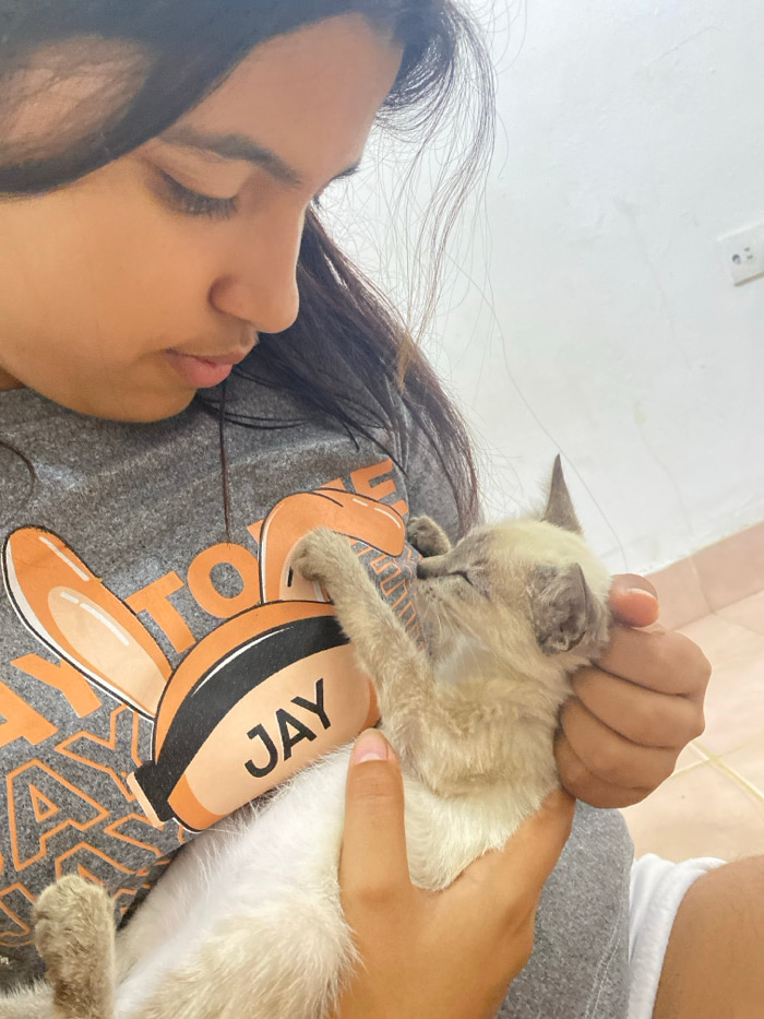 A woman with long dark hair lies on her side, cradling a Siamese kitten in her arms. The kitten is nestled against her gray t-shirt, eyes closed and paws relaxed. A hand rests gently on the kitten's h…read more