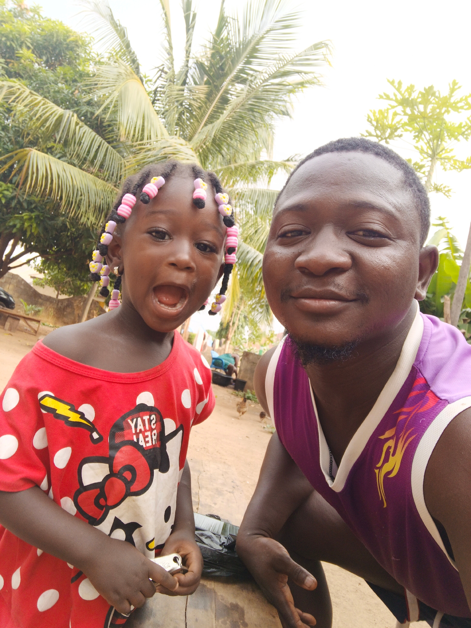 The image shows a man and a young girl in what appears to be an outdoor setting in Akwanga, Nigeria. The girl, positioned on the left, wears a red and white polka-dot shirt with a cartoon character on…read more