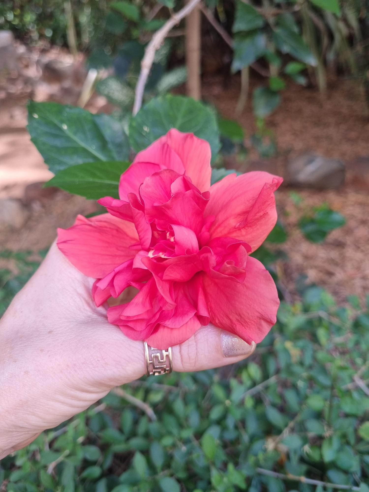 A hand holding a red hibiscus flower is displayed against a background of greenery and a patch of brown ground. The hand is light-skinned and features a gold ring with a Greek key pattern on the thumb…read more